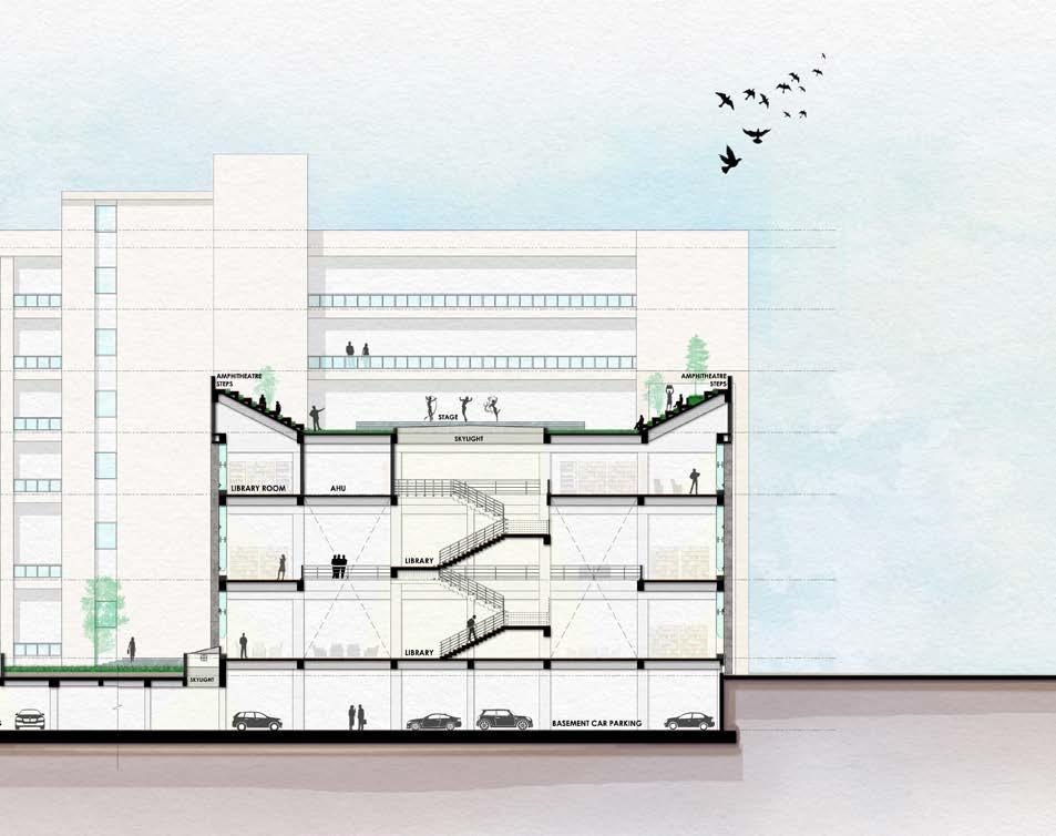 Section B-B’ Section through Banquet cum restaurant, indoor games room and Auditorium, showcasing their seating deign and supporting facility rooms at different levels.