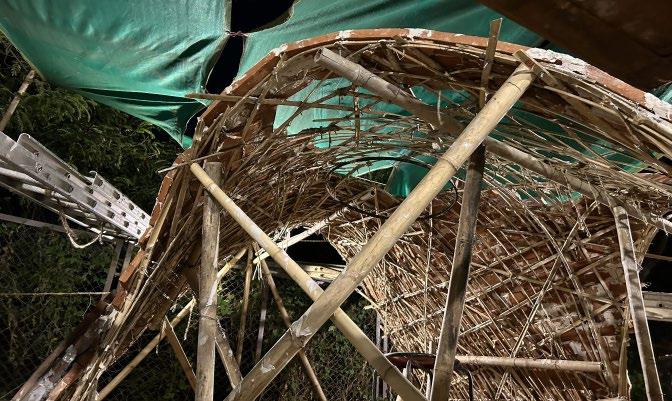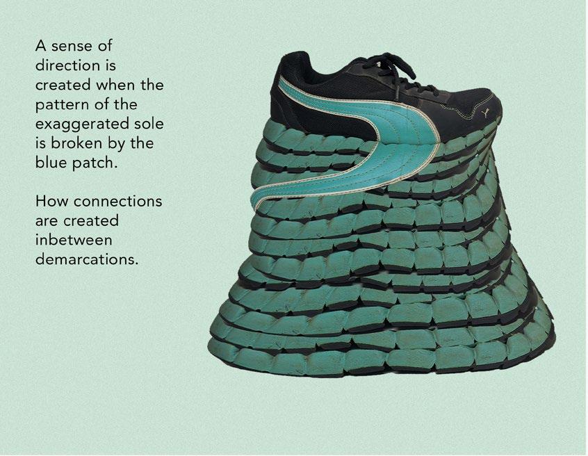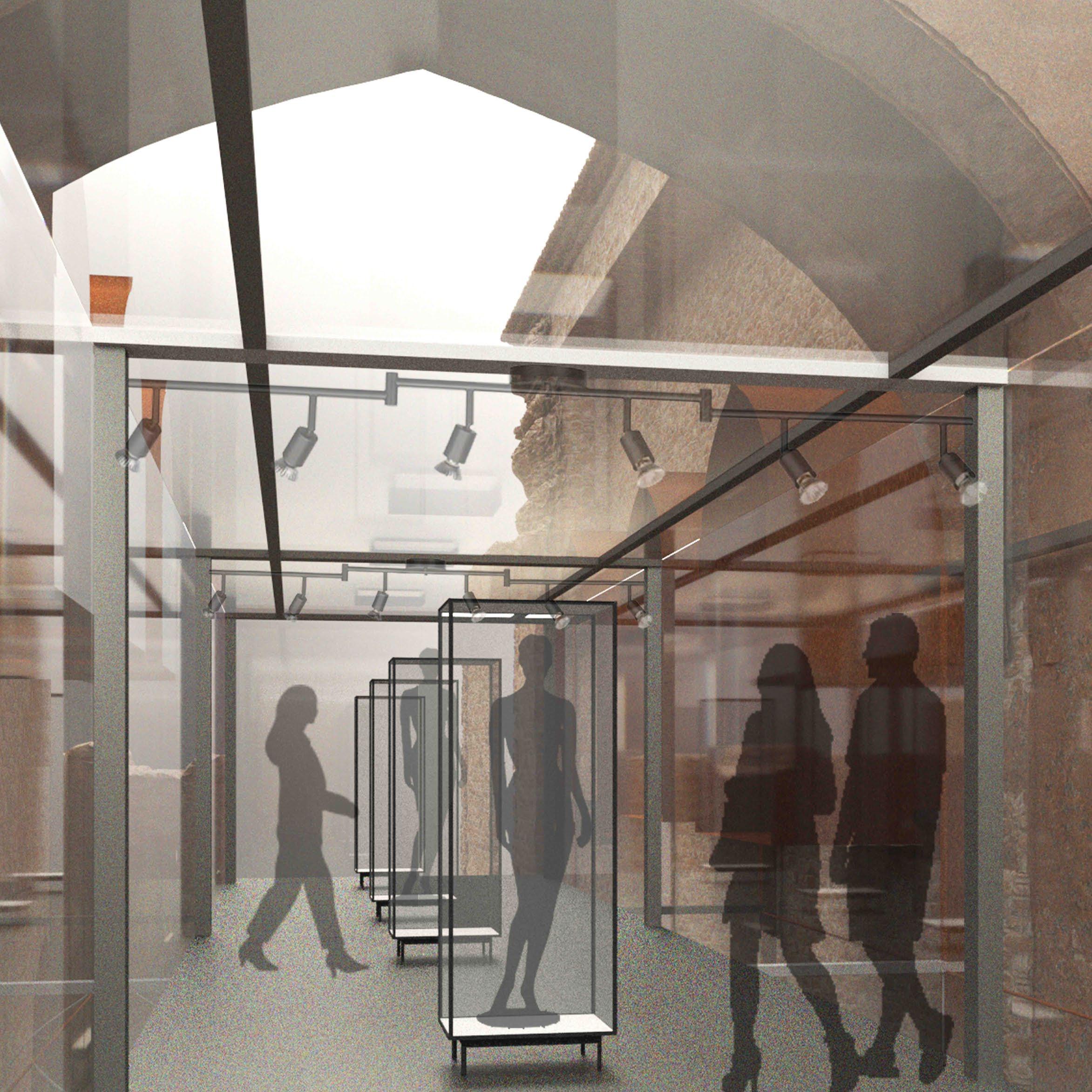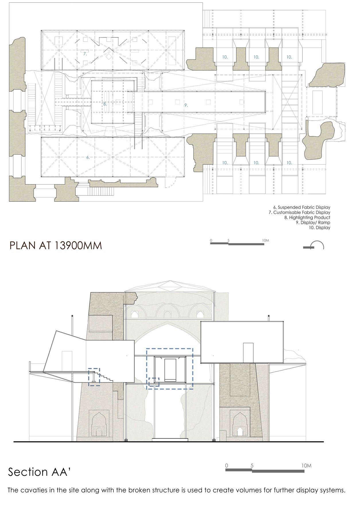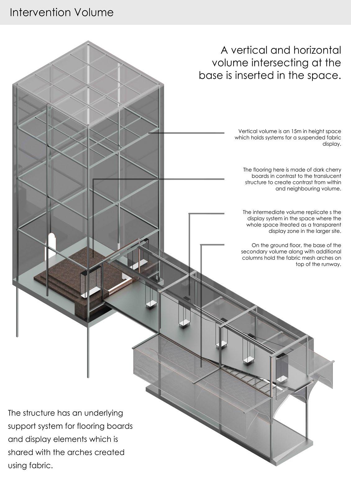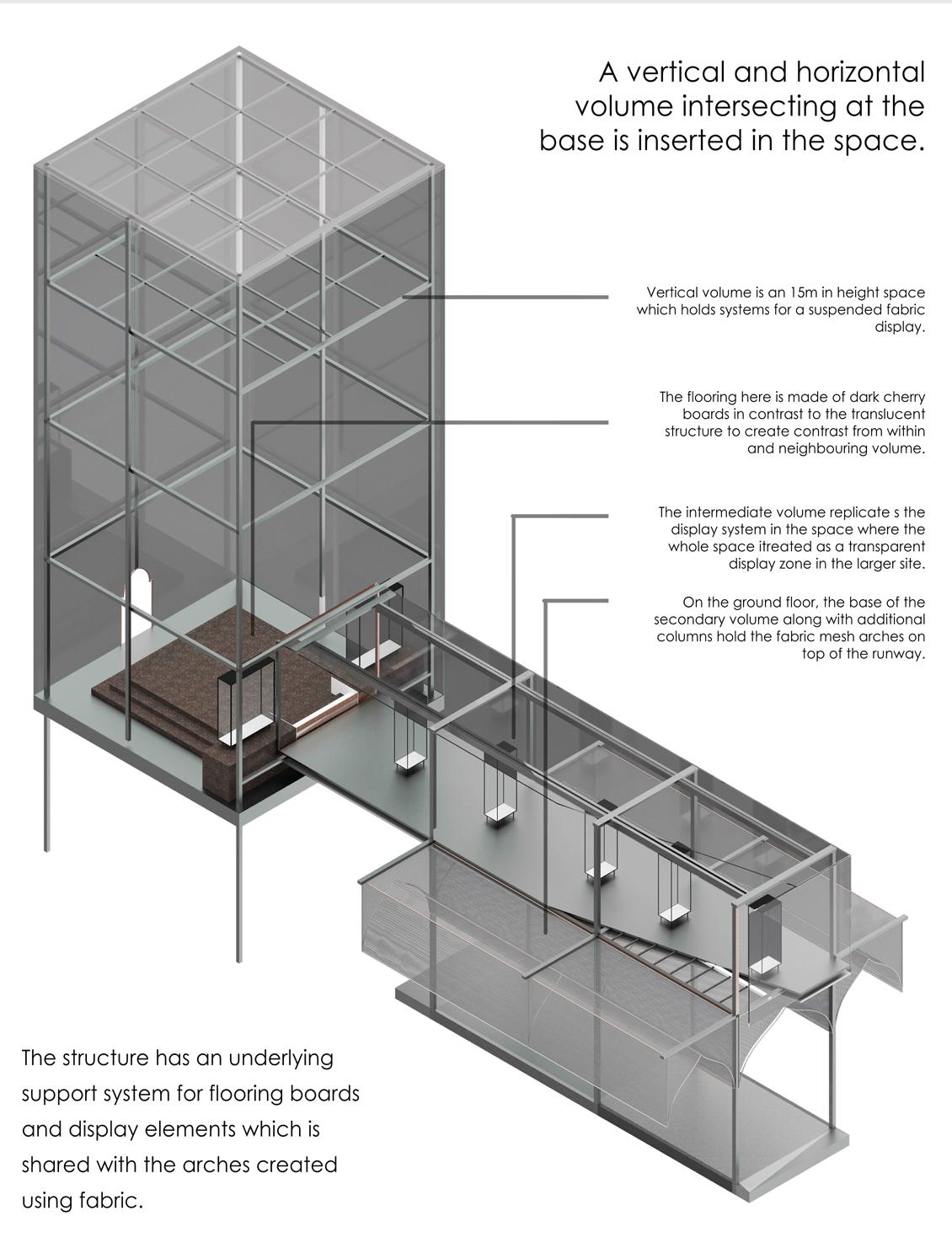 The geometry is replicated and broken in the intervention to create a structure that reflects seamlessness with the site to make space for high-end fashion design collaboration with local textiles. The intervention uses materials like glass and fabric mesh, allowing visual access while walking through the site and displaying dress and fabric.