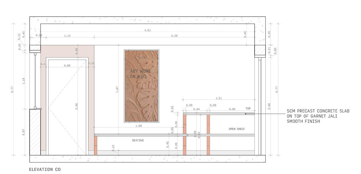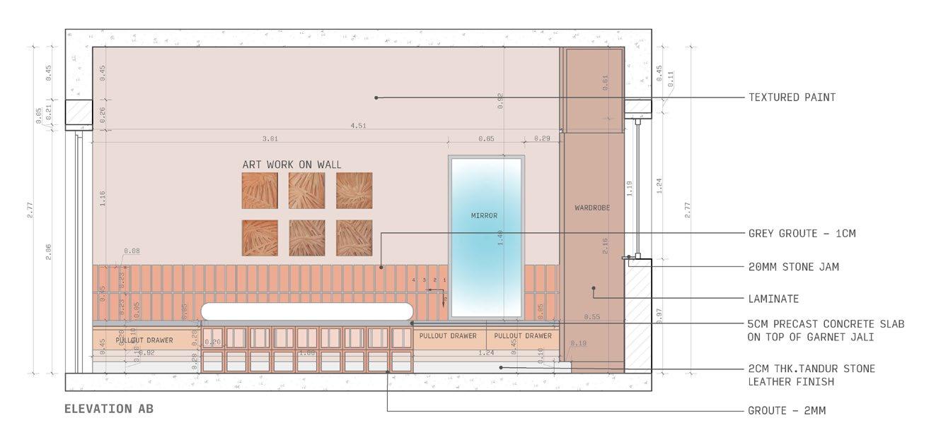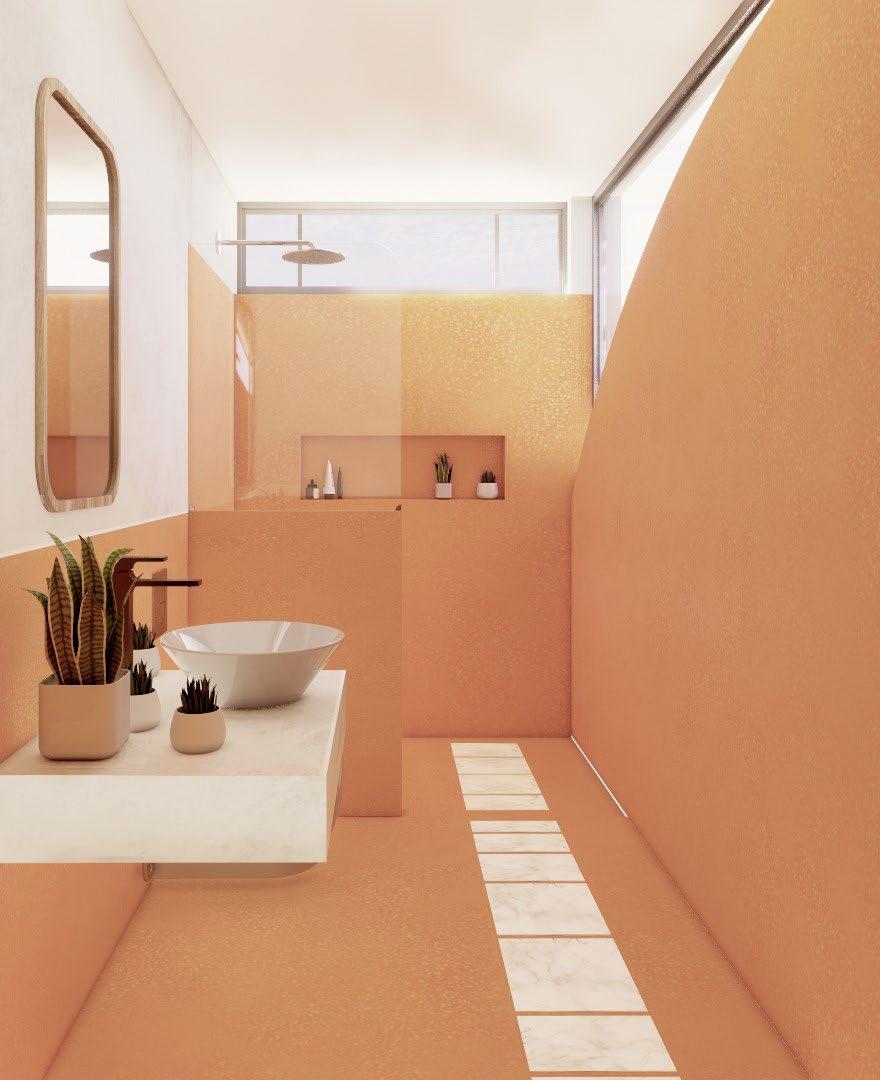 It designed with a contemporary aesthetic that emphasizes the use of natural materials and oxides. These features will be complemented by a modern color palette and sleek, minimalist furnishings that enhance the contemporary look. The same is used in designing of the bathroom where faded red and white oxide has been used alongside marble slab inlay on the floor.