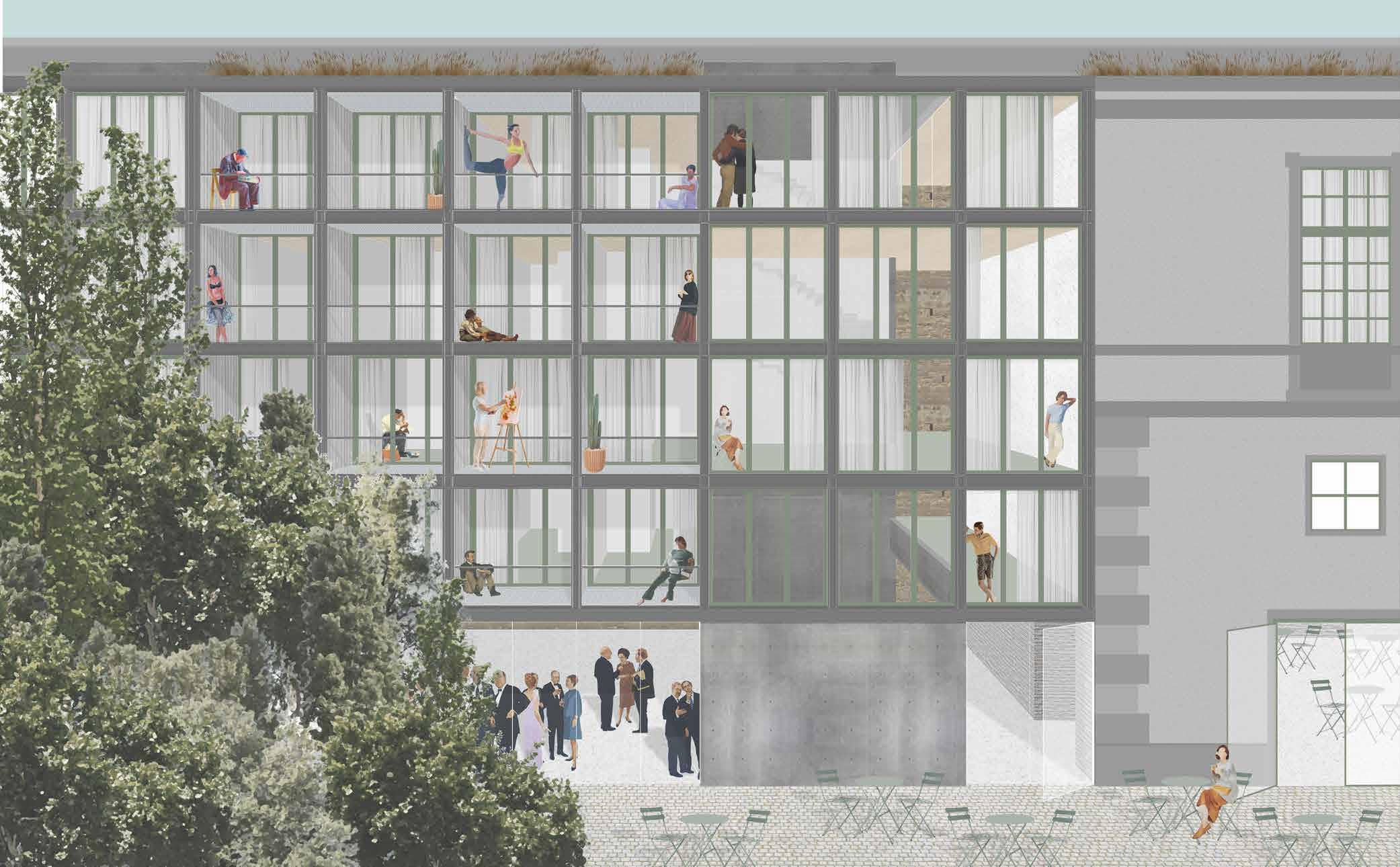 The building is nestled in between a steep hill covered with lush greenery to the west and the western wall of Albergo dei Poveri to the east. This odd and currently unused space gave inspiration for creating a form that is decisive in its direction and form. With the strong gesture of placing the building in this restricted form the movement and orientation of its surroundings are emphazised. Working, studying and living inbetween history and nature creates a unique environment for students, residents and visitors to enjoy.