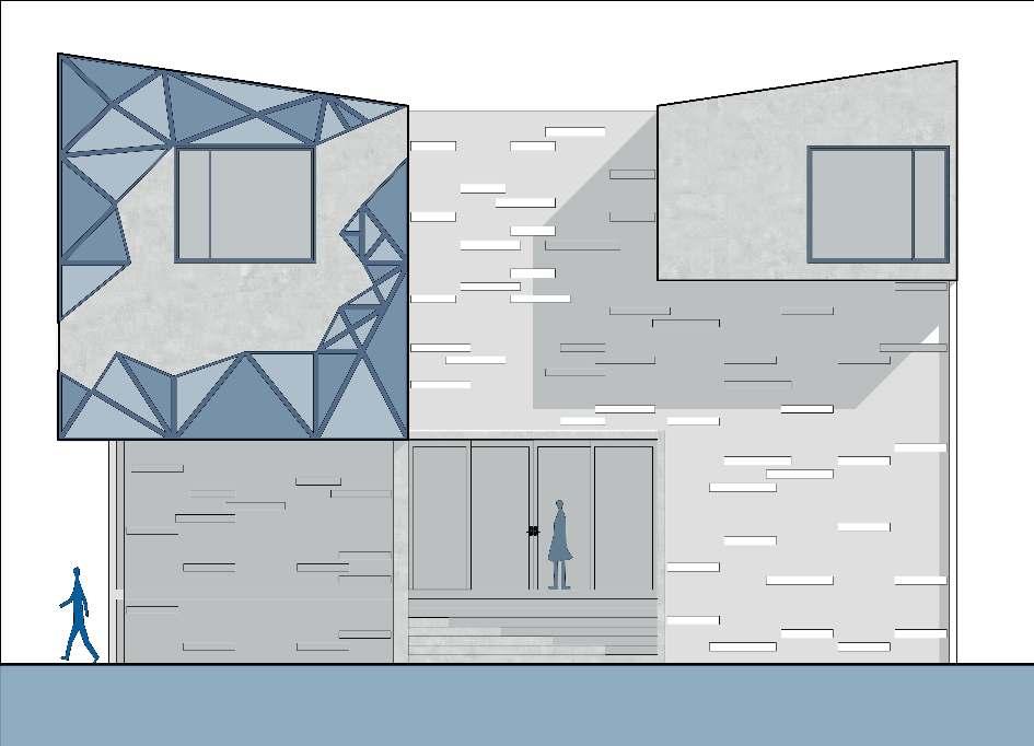 Fachada principal con acabados en concreto texturizado de 3 tonos de grises