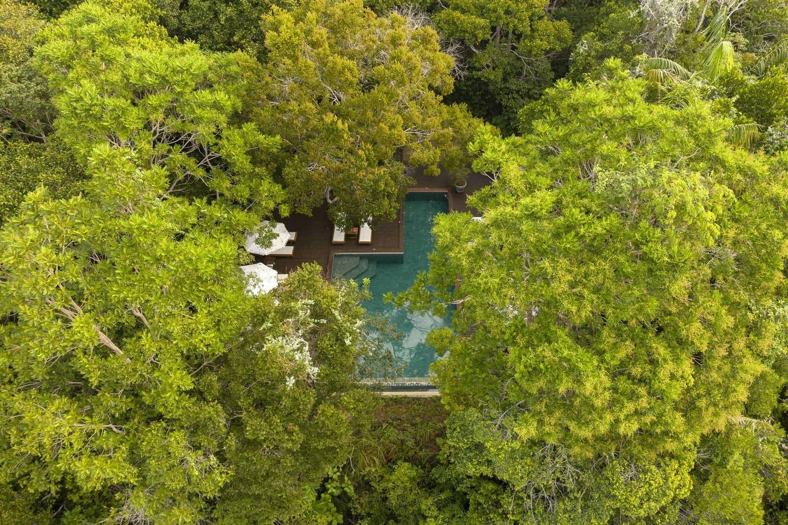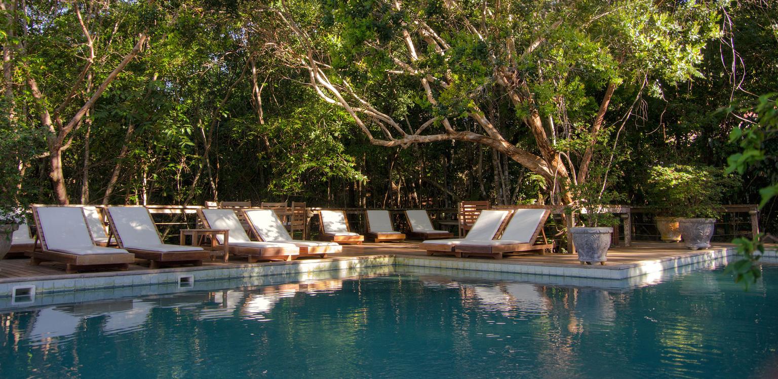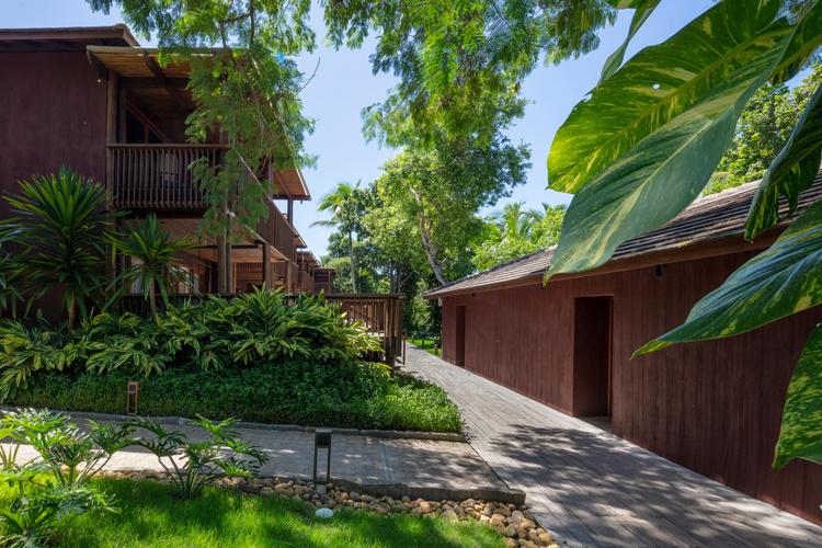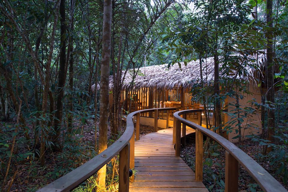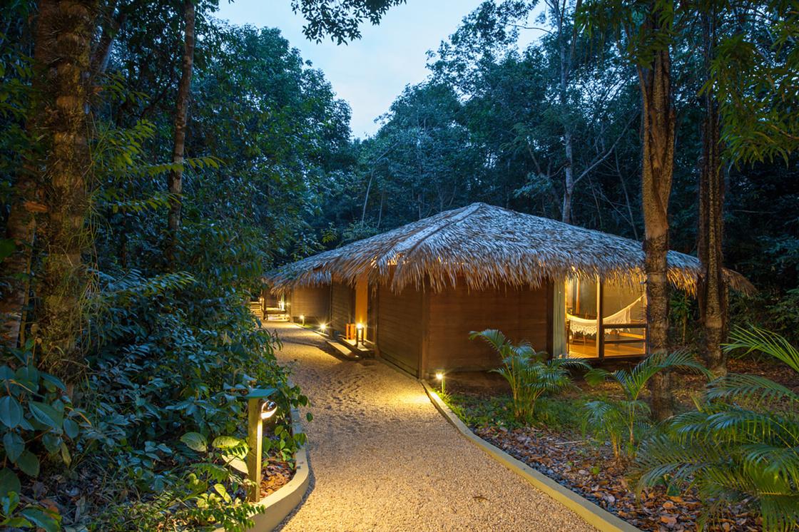 O hotel está disposto por entre a selva amazônica, onde 22 chalés e bangalôs constituem as acomodações.