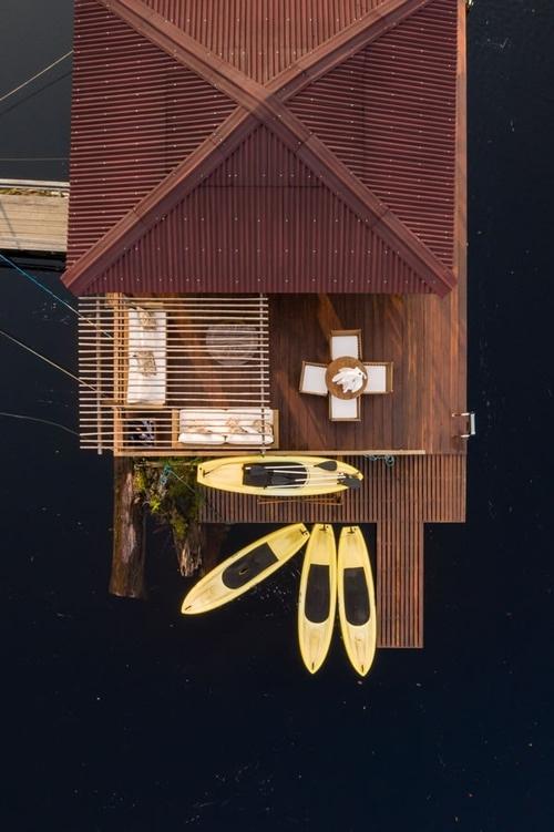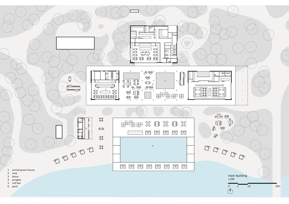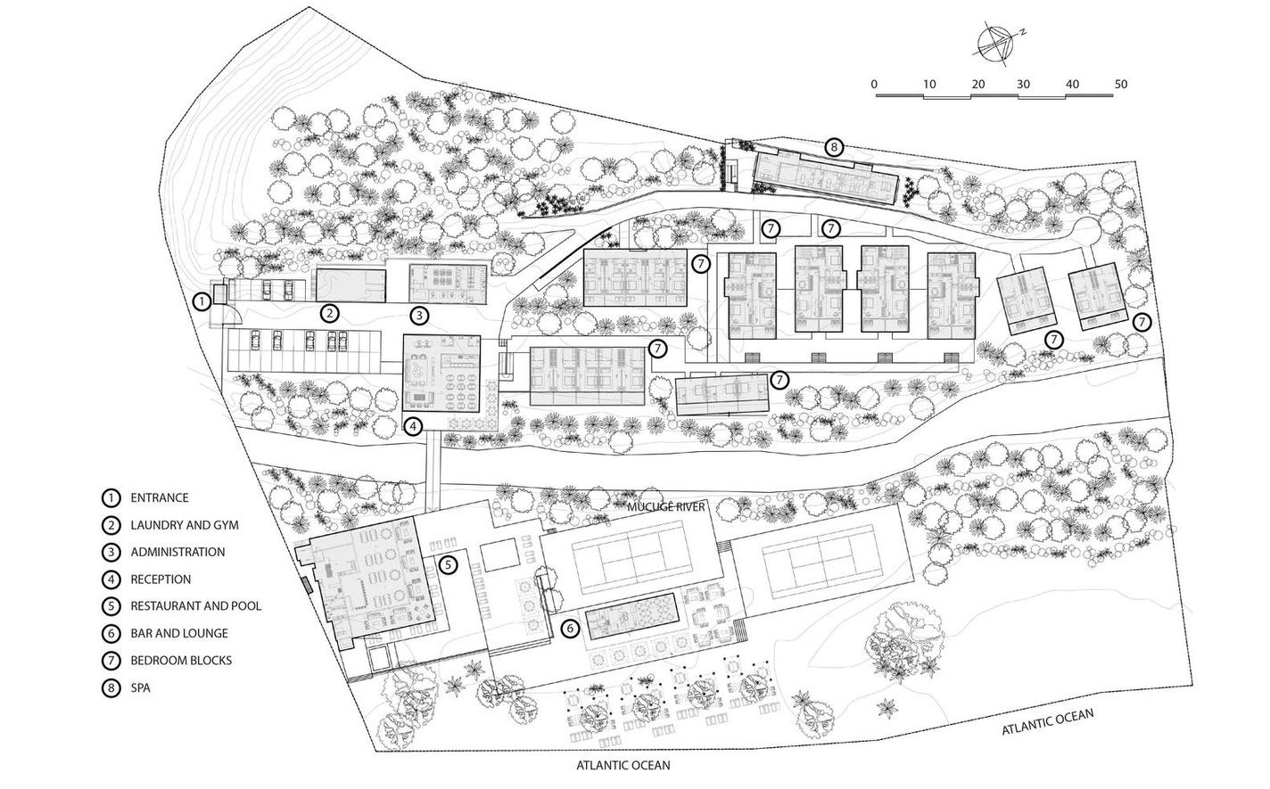 A construção é dividida em vilas, adornadas pela paisagem da ilha, onde as áreas comuns mais importantes recebem destaque, criando uma hierarquia de focos para os diferentes ambientes. (ARCHDAILY, 2021)