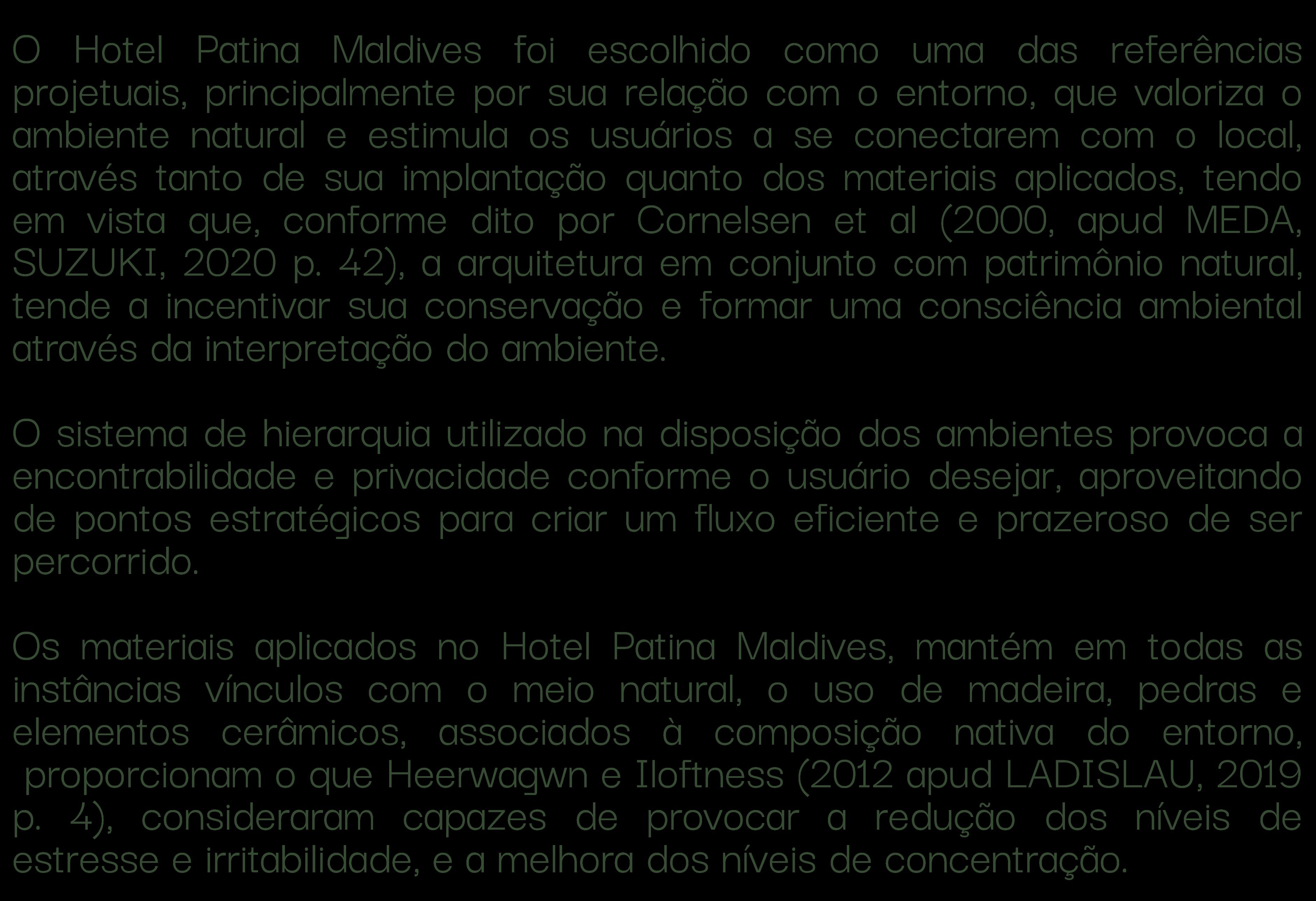PATINA MALDIVES HOTEL / STUDIO MK27. Archdaily, 2021. Disponível em: <https://www.archdaily.com/966794/patinamaldives-hotel-studio-mk27-plus-renata-furlanetto>. Acesso em: 21 de set. de 2022. KÛARA HOTEL / DAVID GUERRA. Archdaily, 2021. Disponível em: <https://www.archdaily.com.br/br/928111/kuara hotel david guerra?ad source=search&ad medium=projects tab>. Acesso em: 21 de set. de 2022. HOTEL DE SELVA. AMZ Arquitetos, 2006. Disponível em: <https://amzarquitetos.com/projeto/44/hotel_de_selva/>. Acesso em: 22 de set. de 2022. MEDA, Juliana Fernandes; SUZUKI, Juliana Harumi. Eco-arquitetura: Considerações para o Incremento do Turismo Ecológico. Revista Terra e Cultura, 2020. Disponível em: <http://periodicos.unifil.br/index.php/Revistateste/article/view/1411>. Acesso em: 23 de set. de 2022. LADISLAU, Amanda de Lourdes. Biofilia e Sustentabilidade: Relação arquitetura-homem-natureza. Repositório de Trabalhos de Conclusão de Curso, 2019. Disponível em: <http://pensaracademico.facig.edu.br/index.php/repositoriotcc/article/view/1670/1290>. Acesso em: 24 de set. de 2022. referências rbibliográficas eferências bibliográficas