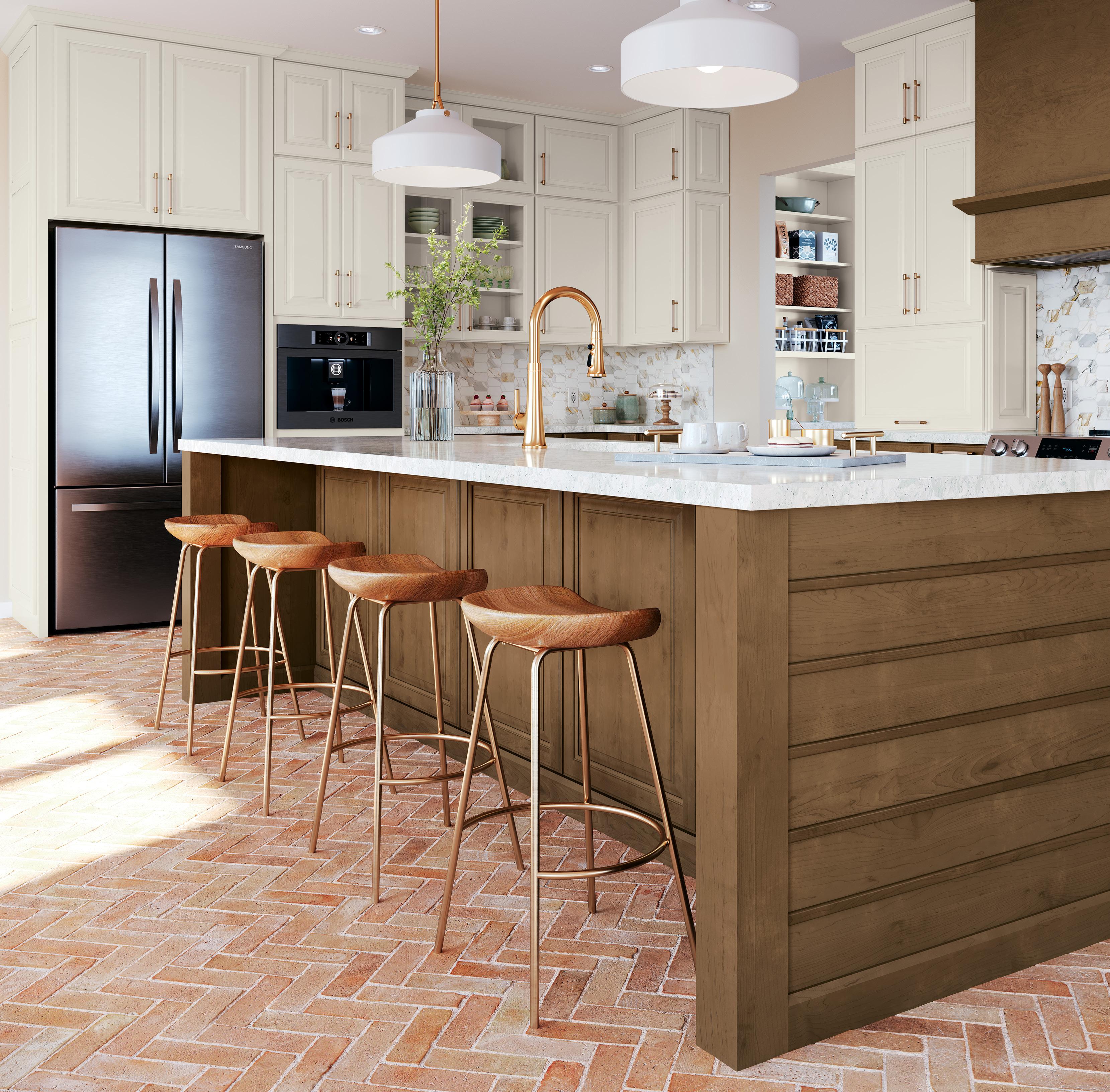 Color options for cabinetry, hardware, faucets, sinks, backsplash tile and flooring, are endless! These days adding more than one color in your product selections is the trend – especially with kitchen cabinetry. Designs have progressed from two cabinet colors to a trend of three to four paint and wood looks woven into the design.