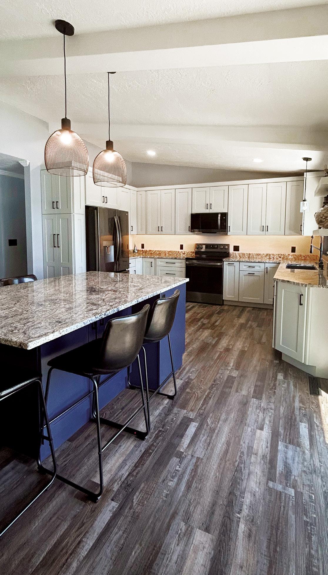 A creamy white palette really opens up this transitional kitchen and bounces light around the space. Six barstools at the island serve as a casual dining spot with deep blue cabinets to pull in a “Lake Living” vibe. New floors add warmth to the room’s style. There is tons of added storage, open cabinets and multiple personalized storage solutions.