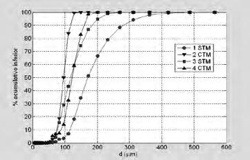 En la Figura 4 se muestran los resultados de los estudios de granulometría laser realizados a las semillas obtenidas en los 11 experimentos anteriores. Estos fueron obtenidos en los laboratorios del Departamento de Ingeniería Química y de Materiales de la Facultad de Ingeniería de la Universidad de Estudios de Roma, La Sapienza, Italia. En la figura mencionada se grafica el % acumulativo inferior contra el tamaño del grano en micrómetros. Con el objetivo de propiciar una mayor claridad de los gráficos, se muestran solo las curvas correspondientes a 4 muestras: 2 de ellas con tratamiento magnético (CTM) y 2 sin tratamiento magnético (STM). Para ello fueron seleccionadas las curvas de comportamiento límite correspondientes a cada caso.