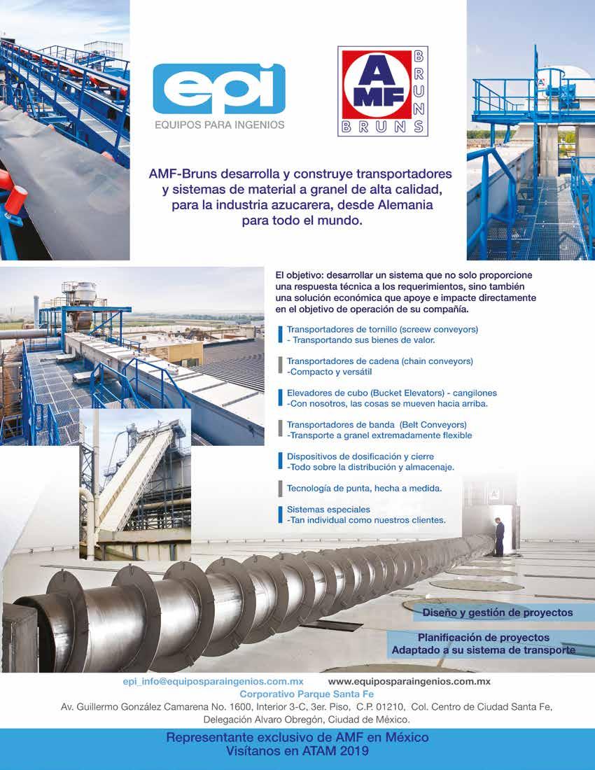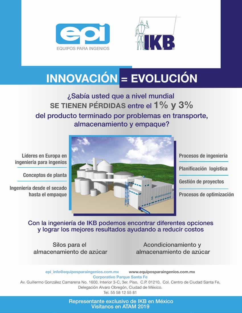 ATAM,Año32,No.1,ENERO-MARZO2019,es una publicación trimestral editada por la Asociación deTécnicosAzucareros de México,A.C. Río Niágara11ColoniaCuauhtémocMéxico,D.F C.P. 06500 Tel.: +52 (55) 55145121 y (55) 55142567 www.atamexico.com.mx atam@atamexico.com.mx Editor responsable: Ing Fernando Martínez Reservas de Derechos al Uso Exclusivo No. 04-2017-062019091400-102, , otorgado por el Instituto Nacio-nal del Derecho de Autor, Licitud de Título y contenido en trámite. Permiso SEPOMEX en trámite. Impresa por Punto Cubico Prepress, Helliot Ariel Sánchez Rangel. Avenida 606-75 Aragón 3ra Sección Del GAM Tel./Fax: (55) 5794 8083 punto cubico@gmail.com Este número se terminó de imprimir el 26 de Abril de 2019 con un tiraje de 1,000 ejemplares. LAS OPINIONES EXPRESADAS POR LOS AUTORES NO NECESARIAMENTE REFLEJAN LA POSTURA DEL EDITOR DE LA PUBLICACIÓN. Queda estrictamente prohibida la reproducción total o parcial de los contenidos e imágenes de la publicación sin previa autorización de la Asociación de TécnicosAzucarerosdeMéxico,A.C.