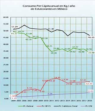 3. Consumo per cápita de diferentes edulcorantes, kg/año (Considerar que los edulcorantes artificiales debido a su efecto potenciador del sabor dulce se expenden en cantidades muy pequeñas, lo que indica que estos kg consumidos por persona están impactando a un sector muy importante de la población)