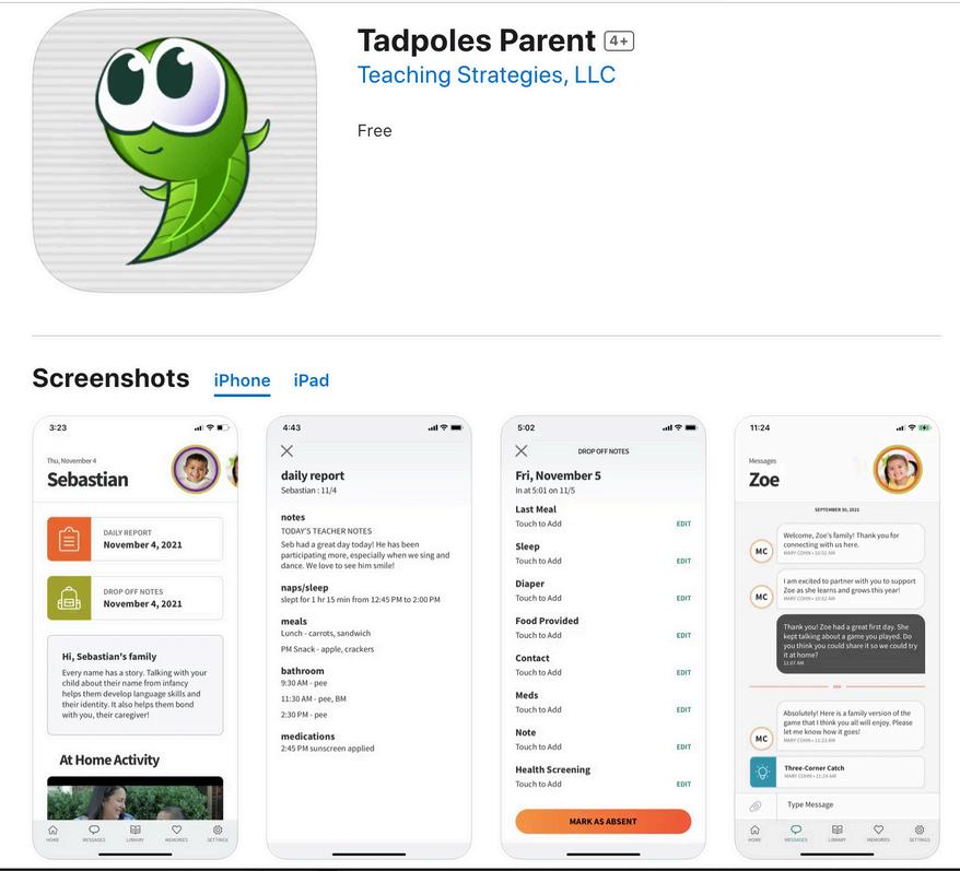 App Store: https://apps apple com/us/app/tadpolesparent/id428376881