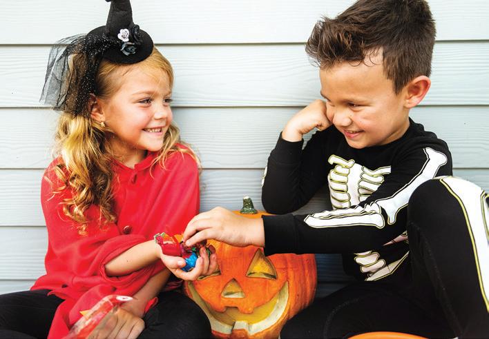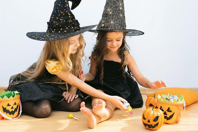 • Children should carry a flashlight or glow stick or have reflective strips on their costumes. Glow stick necklaces are a great idea because they let your kids’ hands stay on their overflowing pumpkinshaped buckets.