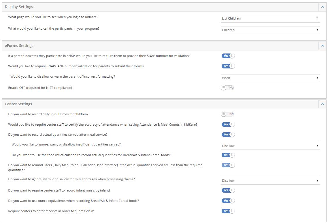 • In the eForms Settings and Center Settings section, these are set to a default selected by the OSDE team.