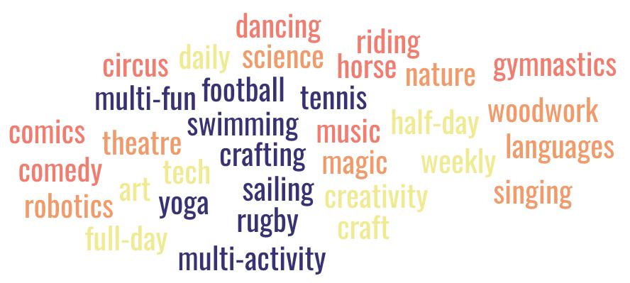 Various ages, weeks and activities... WWF https://www.wwf.ch/ Young Explorers Club https://youngexplorersclub.ch/en/ Evazion https://evazion.ch/ete/ Swiss Camps https://swiss-camps.com/holiday-camps/