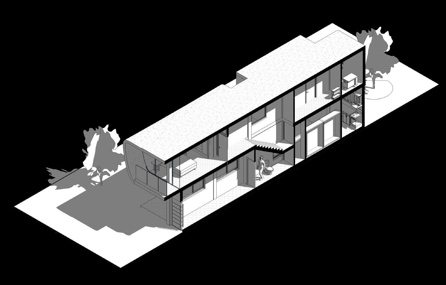 The axonometric section showcases the project’s space utilization, with large north-east openings welcoming morning sun and strategically placed windows and doors allowing natural light to flood the space, enhancing the home’s ambiance.