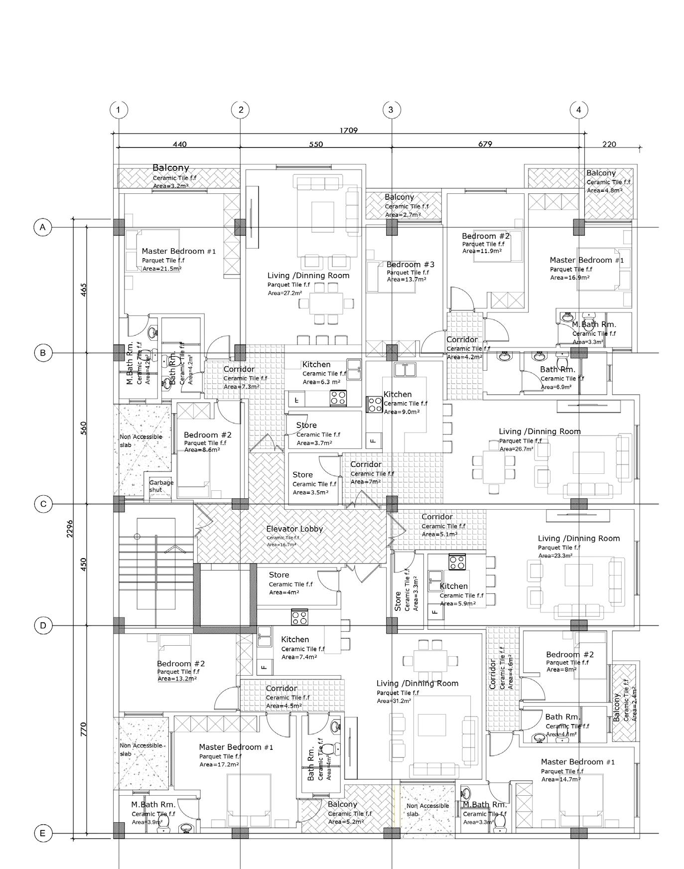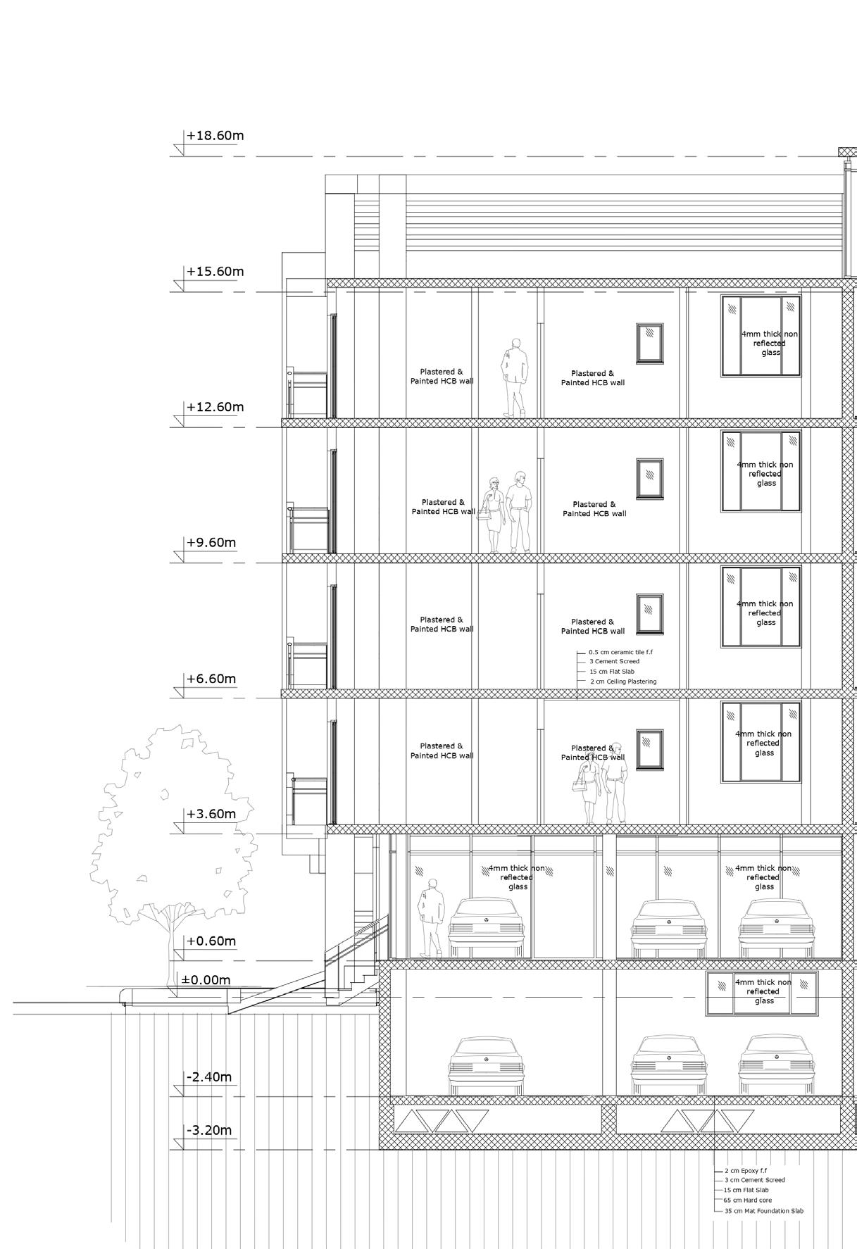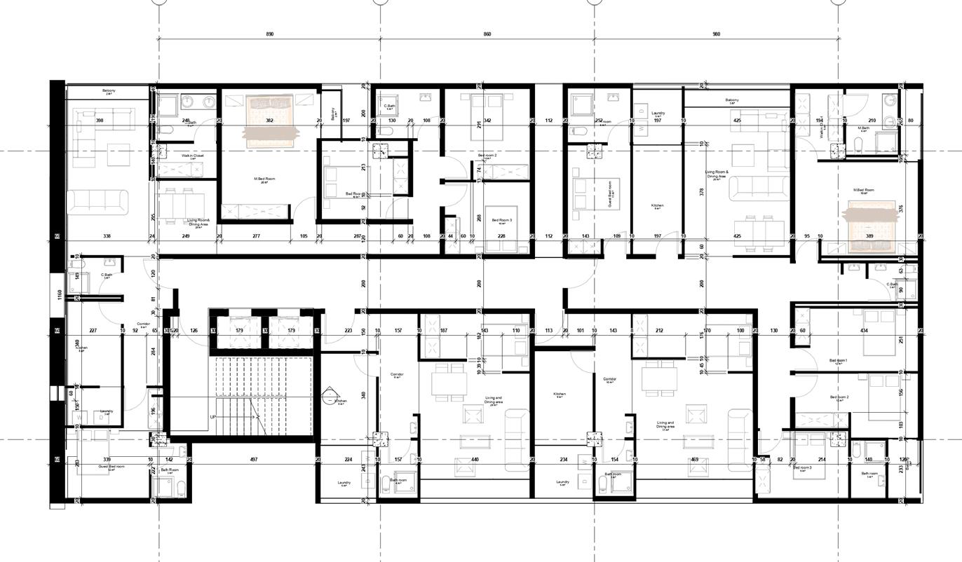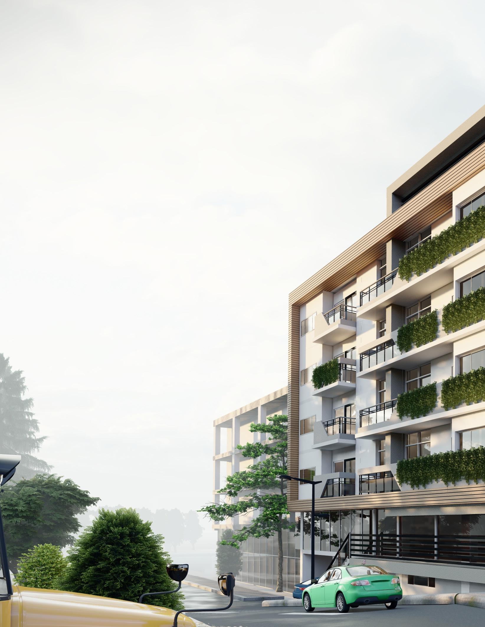 The building features four apartment units per floor: three two-bedroom units and one three-bedroom unit, for a total of 16 housing units with individual parking spaces and a communal rooftop garden for residents to enjoy.