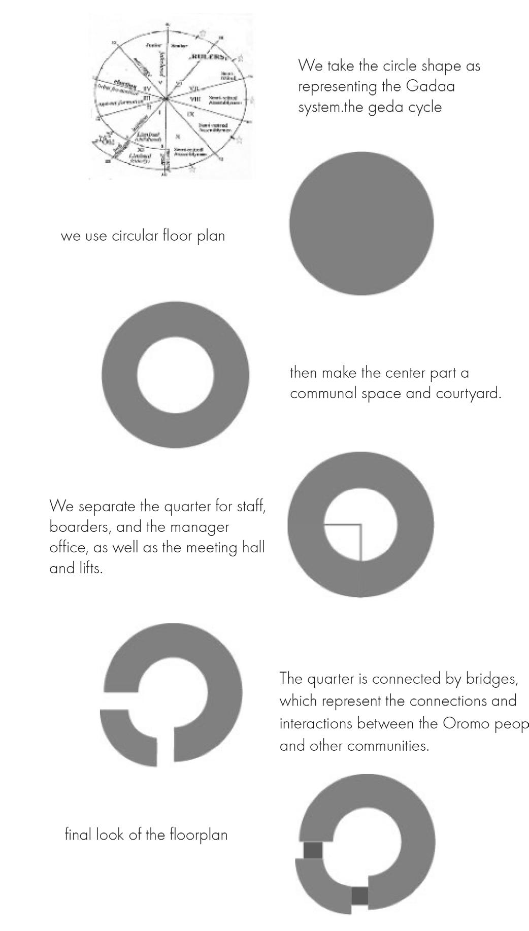 The floor plan is circular, reflecting the cyclical and holistic nature of the Gadaa system, which is based on the principles of democracy, equality, justice, and harmony with nature and humanity.