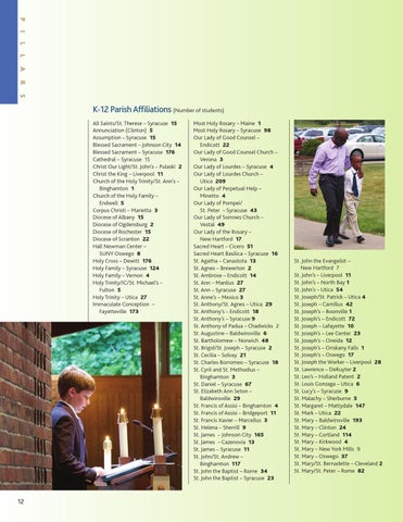 K-12 Parish Affiliations (Number of students) All Saints/St. Therese – Syracuse 15 Annunciation (Clinton) 5 Assumption – Syracuse 15 Blessed Sacrament – Johnson City 14 Blessed Sacrament – Syracuse 176 Cathedral – Syracuse 15 Christ Our Light/St. John’s – Pulaski 2 Christ the King – Liverpool 11 Church of the Holy Trinity/St. Ann’s – Binghamton 1 Church of the Holy Family – Endwell 5 Corpus Christi – Marietta 3 Diocese of Albany 15 Diocese of Ogdensburg 2 Diocese of Rochester 15 Diocese of Scranton 22 Hall Newman Center – SUNY Oswego 8 Holy Cross – Dewitt 176 Holy Family – Syracuse 124 Holy Family – Vernon 4 Holy Trinity/IC/St. Michael’s – Fulton 5 Holy Trinity – Utica 27 Immaculate Conception – Fayetteville 173