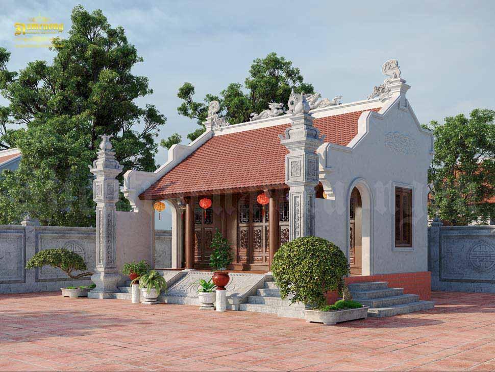 Mẫu thiết kế nhà từ đường có sân vườn này thu hút người nhìn bởi vẻ đẹp truyền thống, bình yên và gần gũi Nhà từ đường được thiết kế mang đậm vẻ đẹp truyền thống, dân dã và quen thuộc với hệ thống cột trụ đăng đối và mái ngói đỏ nổi bật, tạo cảm giác hoài niệm về những tháng ngày xa xưa