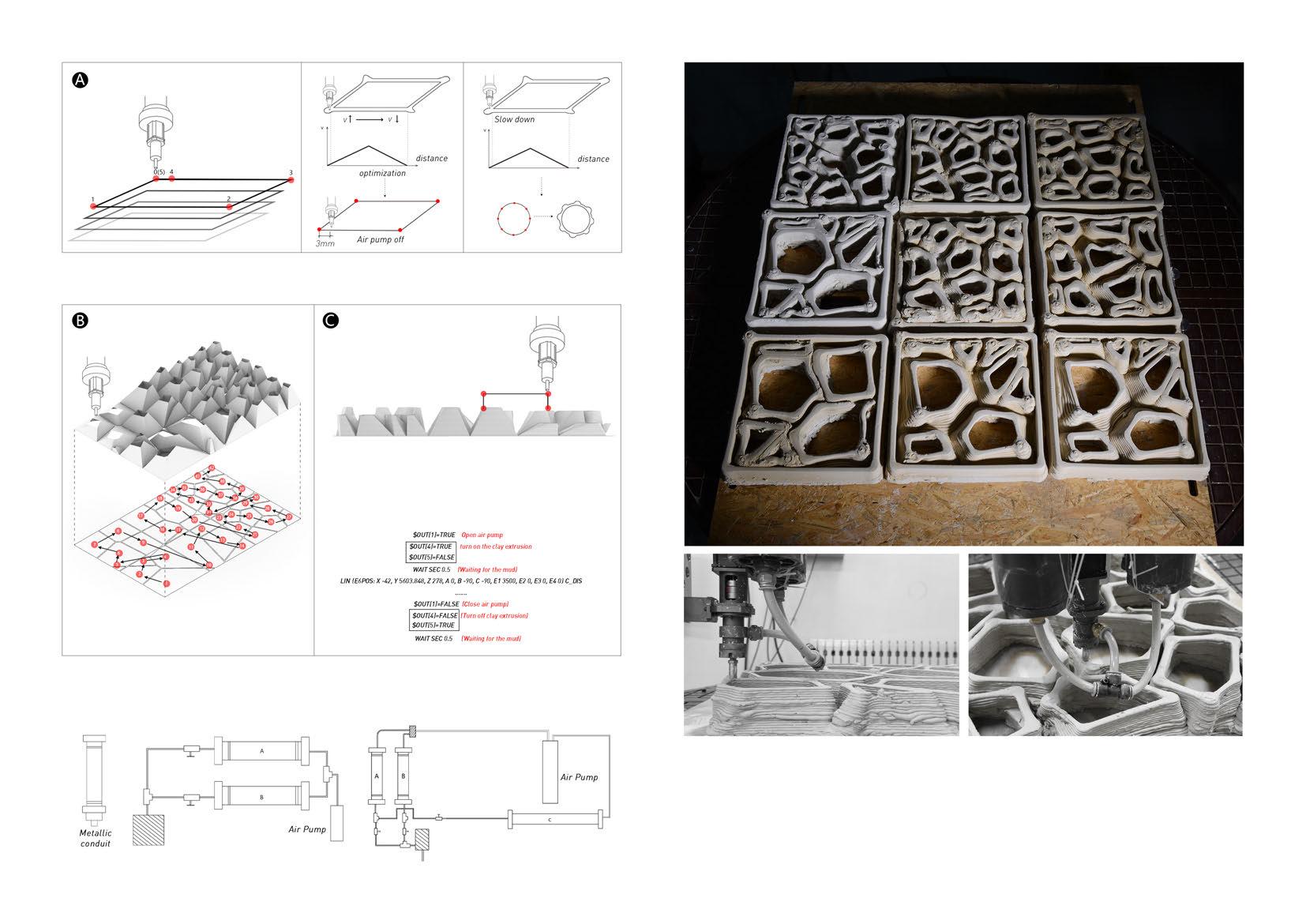 Clay printing has the same characteristics as 3D printing, and the construction concept of generating forms is mainly stack printing. By thinking about how to combine the printing of clay with the application of actual building construction, it can be applied to the building curtain wall system by utilizing the characteristic of diffuse reflection on the surface porous holes. By changing the orientation, size and density of the openings of the layered print, the intensity of sunlight entering the building through the curtain wall is controlled.