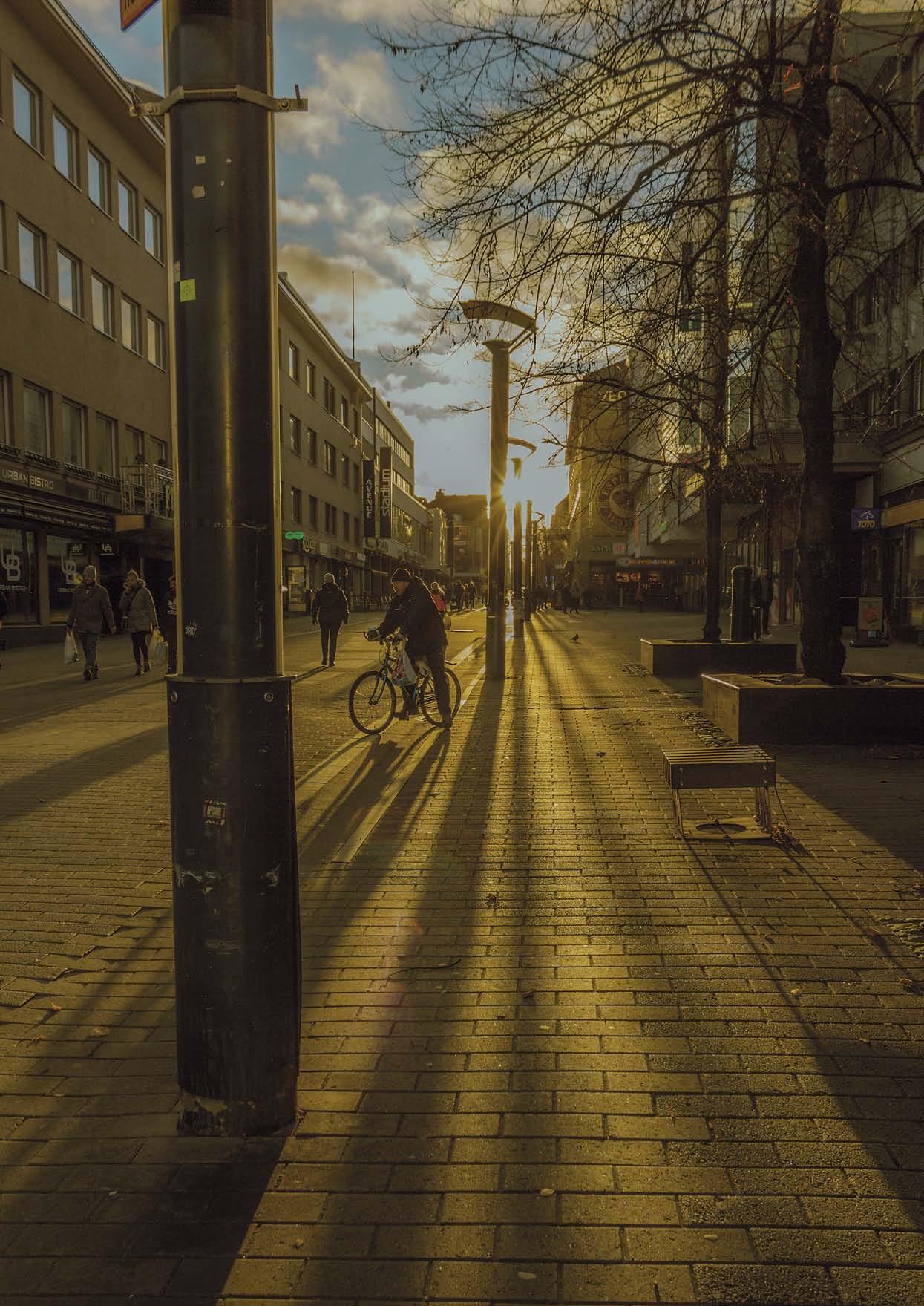 Tämän lehden kansikuva on yksi hänen teoksistaan. Kultainen hetki Jyväskylässä on otettu Kauppakadulla marraskuussa 2024. Kuva vangitsee vastavalon hehkun auringonlaskun aikaan ja ohikulkijoiden varjot, jotka muodostavat dynaamisen kontrastin kaupungin siluettia vasten.