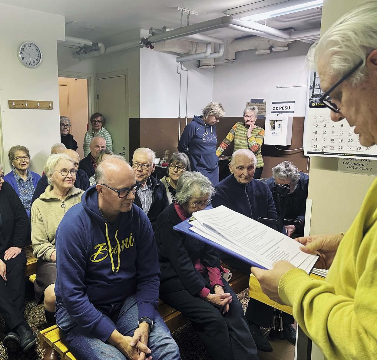 Taloyhtiön hallituksen puheenjohtaja Raimo Peltovuori kertoi kyselyn tuloksista asukasillassa.