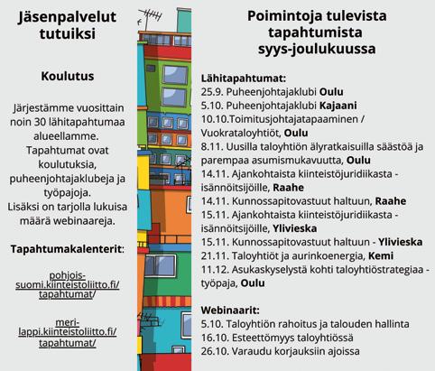 Pääkirjoitus …………………………………………………………………. 4 Blogi: asunto-osakeyhtiön strategian laatiminen on olennainen osa taloyhtiön toimintaa ................................………... 5 taloyhtiöiden asialla ....................................................................…….. 8 Pohjois-suomen taloyhtiöpäivä 10.10. oulussa .....…………….... 12 taloyhtiössä tapahtuu syksylläkin – mietteitä taloyhtiön hallituksen puheenjohtajan näkökulmasta ..…….. . 14 huoneiston omistuksen rekisteröinti ja sen merkitys osakeluettelon siirron jälkeen ............................................………...16 Yhdessä on mukavampaa .............................................................…. 20 mitä isännöitsijänä odotan syksyltä 2023?...........………….......... 22 järjestösihteerin syysterveiset – jäsenpalvelut tutuksi ja tiedot kuntoon ................................................................................. 23 edunvalvontavaltuutus asunto-osakeyhtiön kannalta ............ 24 osakkaan oikeus esteettömyyskorjauksiin taloyhtiön yleisissä tiloissa ............................................................... 26 Kysy – me vastaamme ………………………………………………….. 27 Kannatusjäsenet ……………………………. ........................................ 29 jäsenpalvelut ……………………………………………………………....30 Palveluhakemisto ………………………………………………………... 31 Kiinteistöliitto Pohjois-suomi KIINTEISTÖLIITTO Meri-Lappi Jäsenlehti
