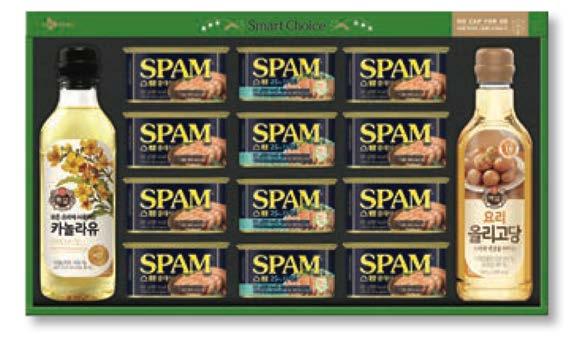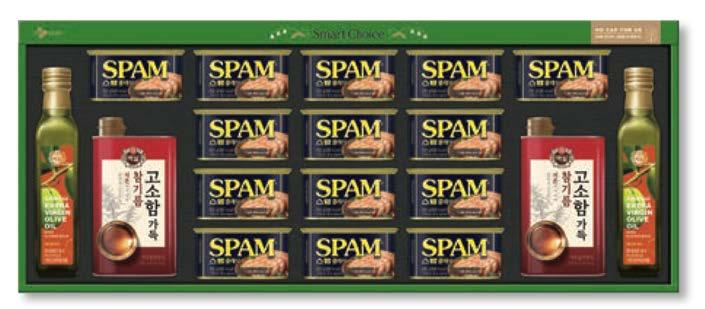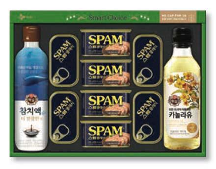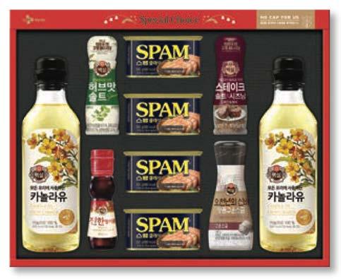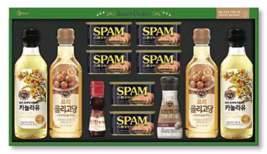 25 청밀 선물세트 - CJ제일제당 스팸혼합세트 I 최고의 선택 프리미엄호 스팸 스위트 1호 스팸 고급유 7호 최고의 선택 특호 스팸 고급유 108호 77,000원 39,000원 23,000원 66,500원 36,000원 146,000원 70,000원 52,400원 136,900원 60,400원 스팸클래식 200gx8개, 백설 포도씨유 500mlx1개, 백설 카놀라유 500mlx1개, 백설 고소함가득 참기름 330mlx2개, 백설 허브맛솔트 시즈닝 순한맛 50gx1개, 백설 스테이크 솔트&시즈닝 40gx1개 스팸클래식 200gx6개, 백설