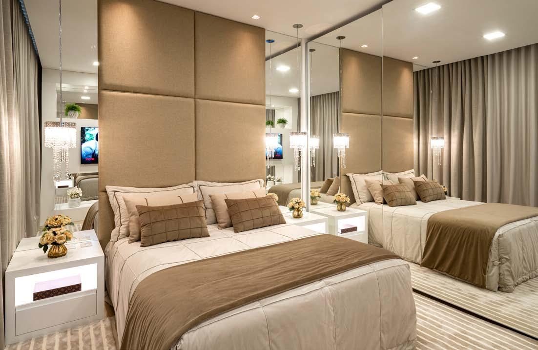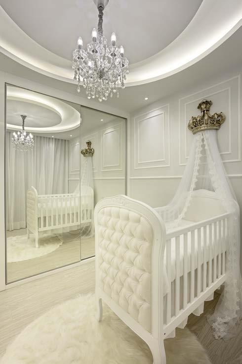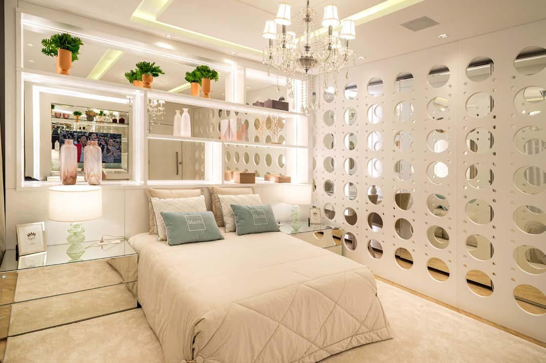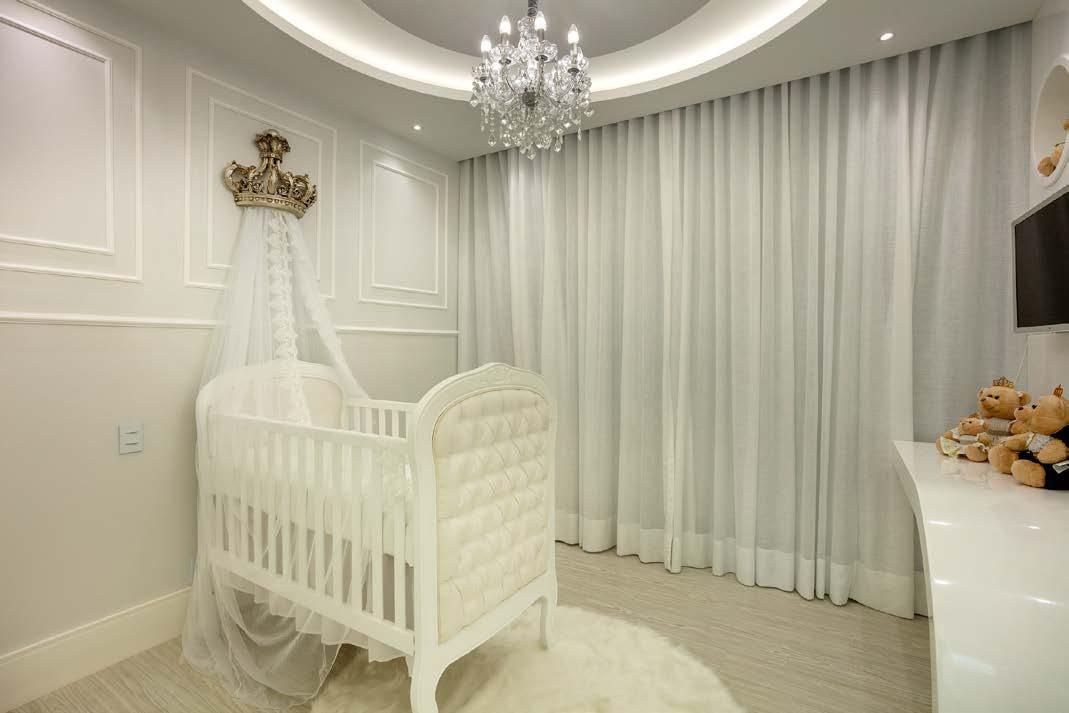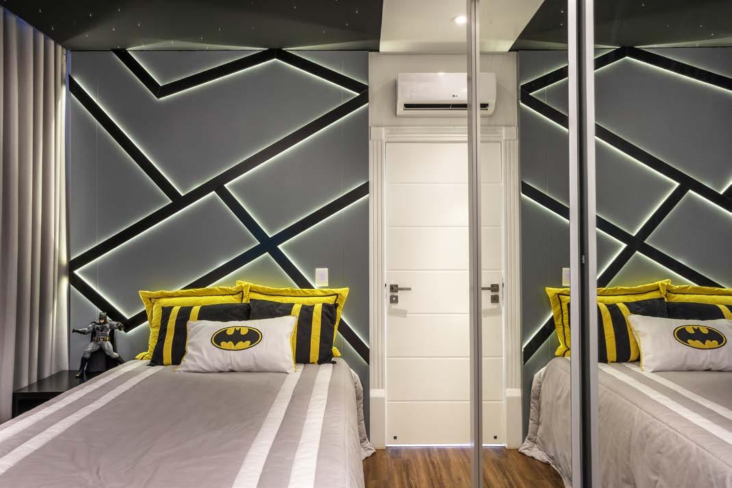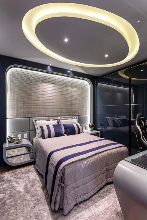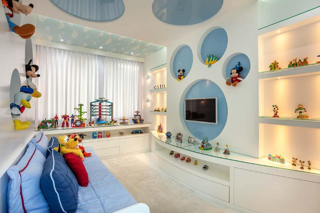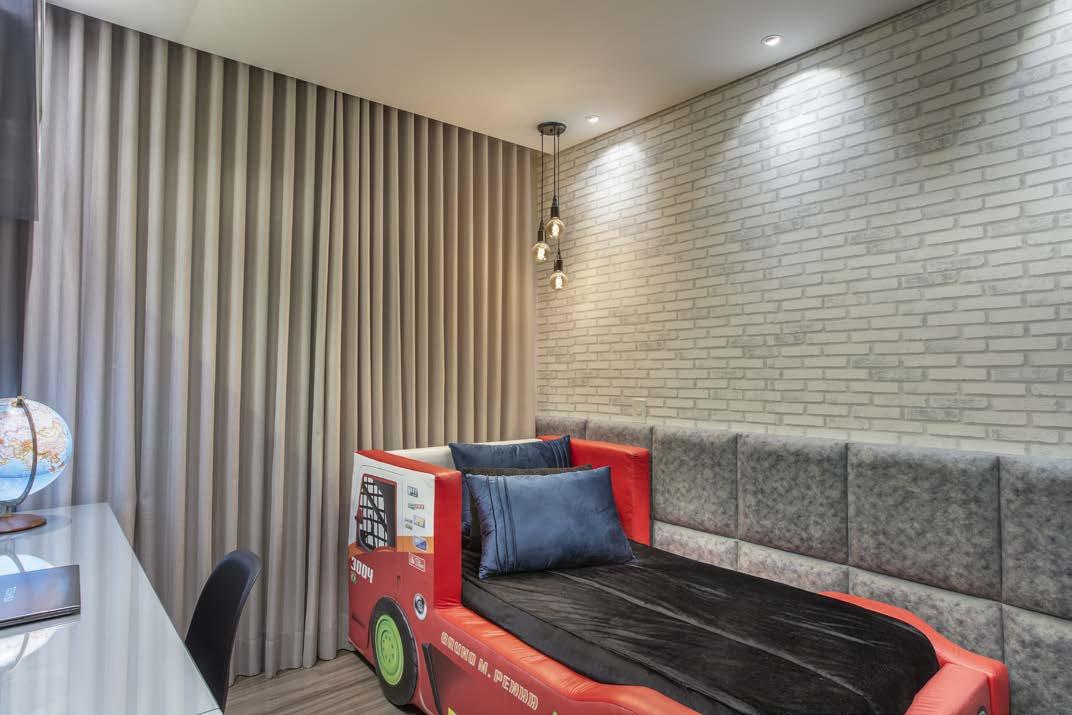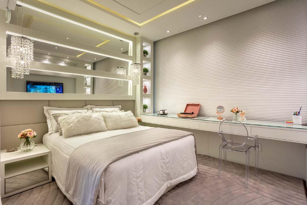 Na suíte do menino, destaque para a cama em forma de carro. Para a menina, a delicadeza das cores claras e nichos iluminados para a decoração. Na suíte máster, a entrada de circulação foi usada como um semi closet.
