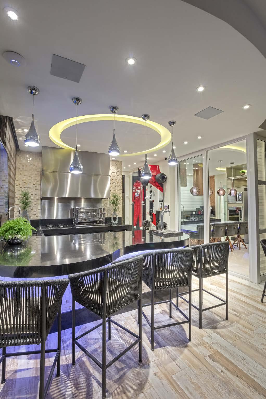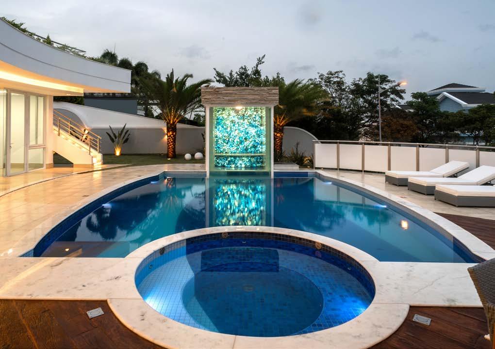 A área de lazer é formada por um espaço gourmet, uma piscina em formato orgânico, com spa e queda d’água. Destaque para um modelo de Fórmula 1 usado na decoração de parede, bem como um macacão de piloto emoldurado para complementar a decoração.