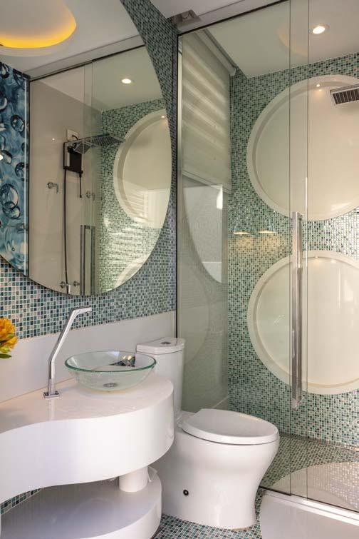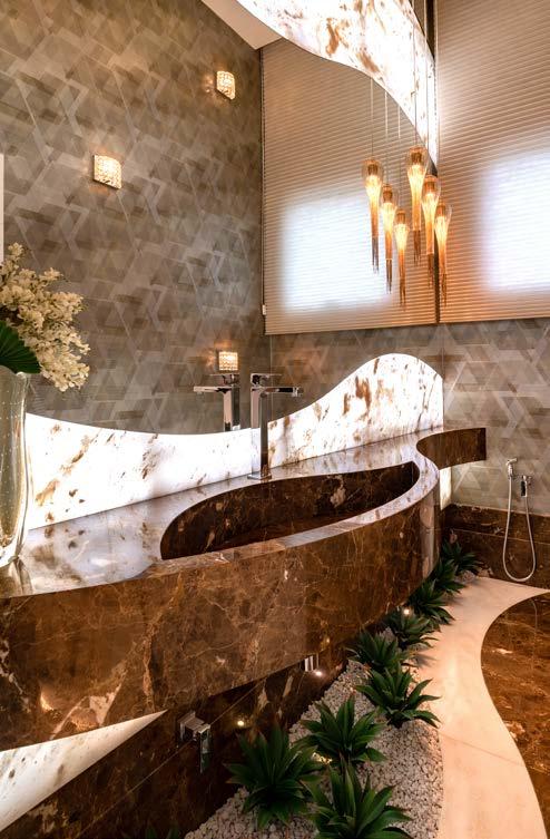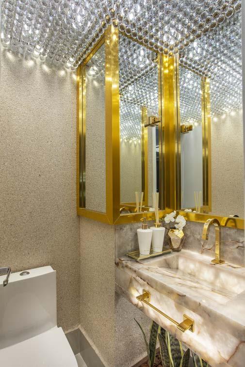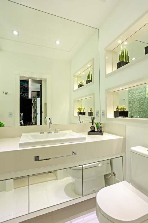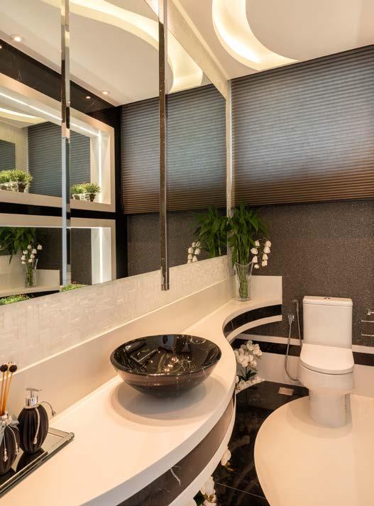 O projeto conta ainda com cozinha toda equipada, lavanderia e lavabo com pedra azul iluminada no espelho e jardim embaixo da bancada da cuba. Uma porta e o corredor separam a área íntima da social.