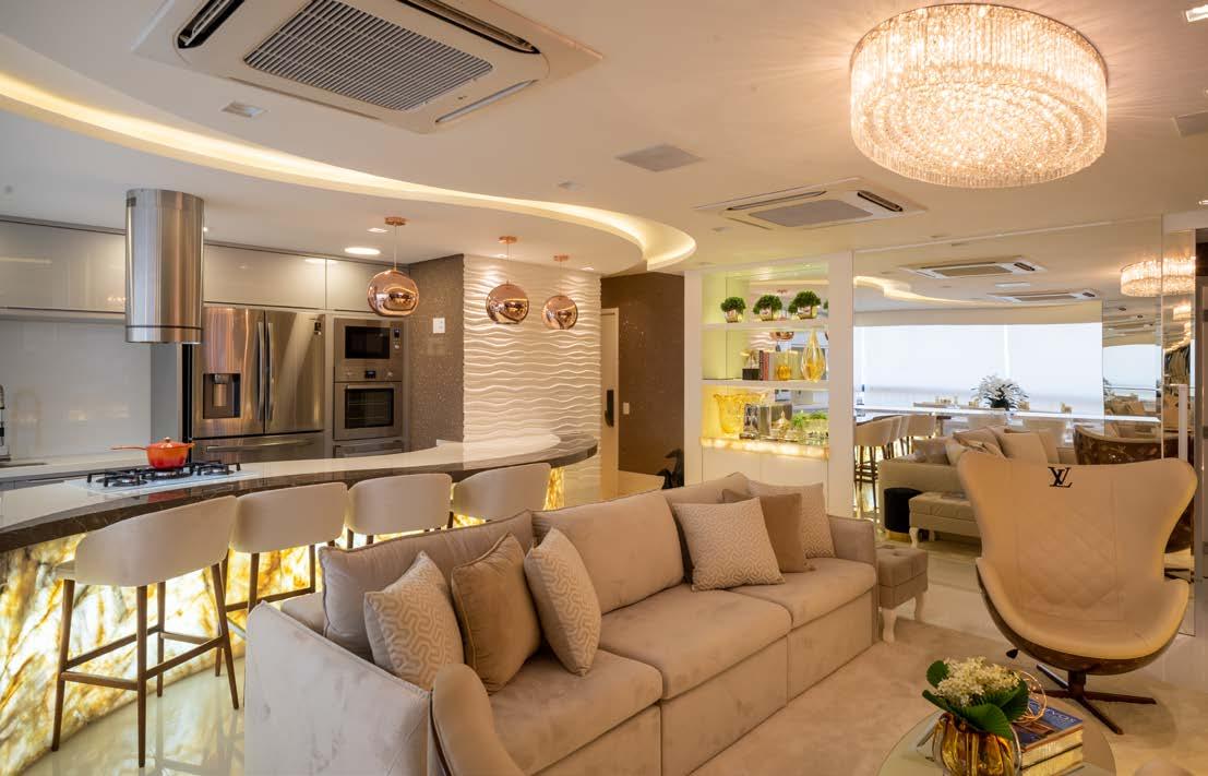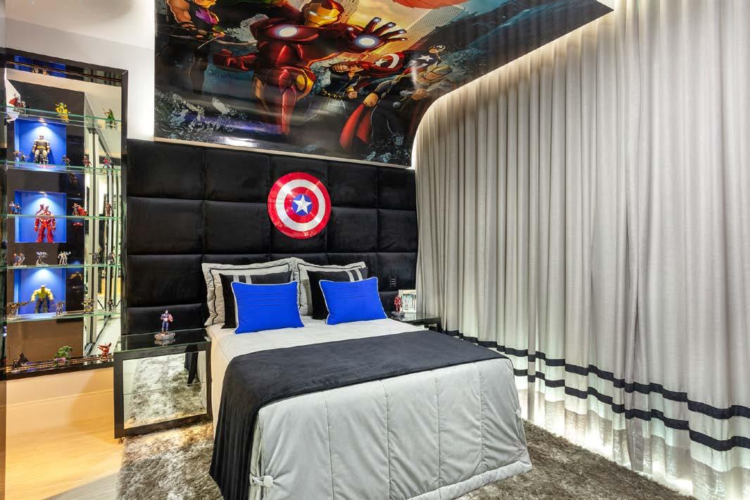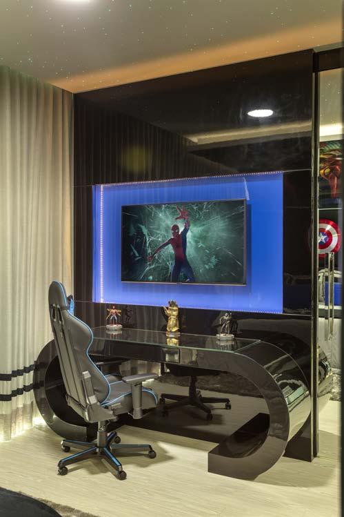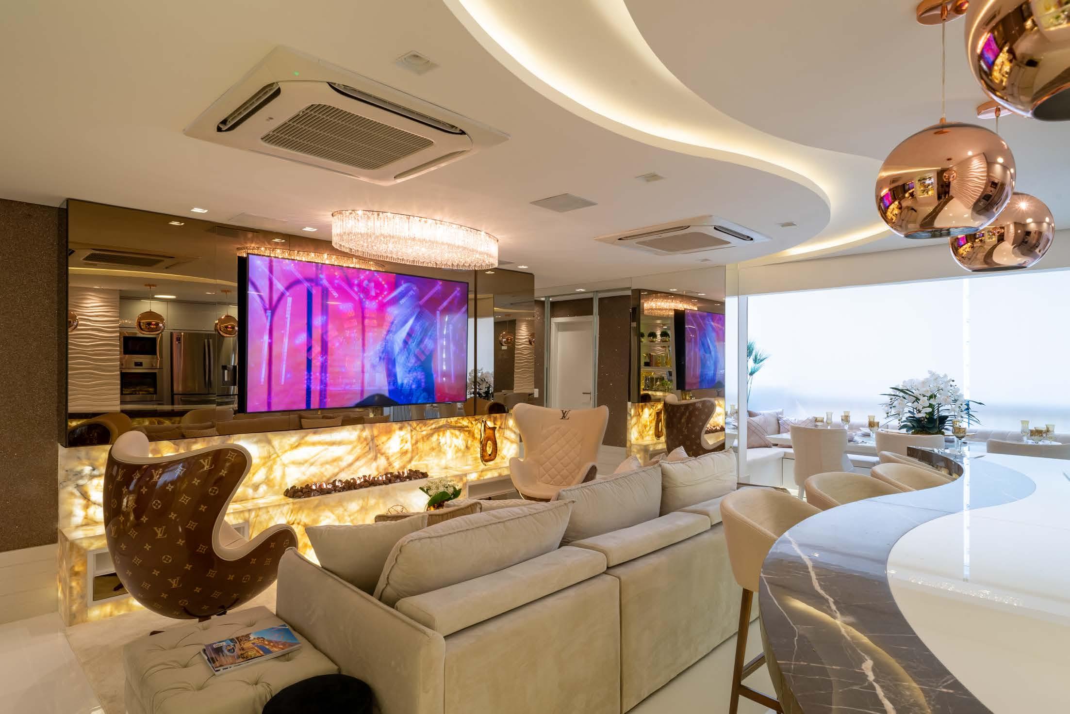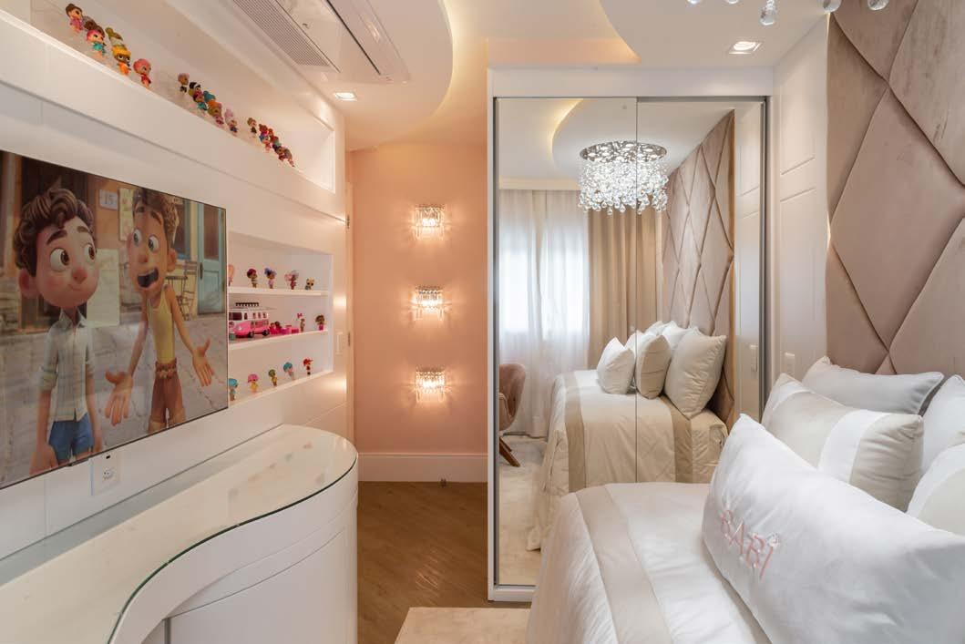 Iara KílarisNa procura por profissionais que projetassem com perfeição e muito conforto um apartamento de 113 m², uma família da Grande São Paulo conheceu pela internet os projetos de interiores assinados pela designer Iara Kílaris. Depois de agendar a primeira visita ao escritório da profissional, o casal passou o final de semana maratonando o Canal Kílaris no Youtube, para conhecer em detalhes o trabalho de Iara. Chegaram para a reunião cheios de ideias e sabendo exatamente o queriam. Assim nasceu o Apartamento Barueri. Por se tratar de um imóvel mais compacto, a varanda gourmet foi integrada à cozinha, recebendo uma única e grande bancada curva com cooktop, usada também para refeições rápidas. De um lado armários, torre para dois fornos e geladeira; de outro churrasqueira e chopeira. A sala de jantar foi ambientada na varanda, deixando assim mais espaço para o living. Na área íntima estão três suítes, máster do casal e dos filhos. No quarto do menino, o tema é super-heróis e decoração com direito a bicama, cadeira gamer, bancada de estudos e teto estrelado com efeito de luz neon. No quarto da filha, todo em branco e rosa, cabeceira almofadada, bancada de estudos, nichos para decoração e um lustre de cristal iluminando todo o ambiente. A suíte máster em tons pastel recebeu uma TV imensa, que ocupa o tamanho da parede em frente a cama. O banheiro é integrado ao quarto com vidro.