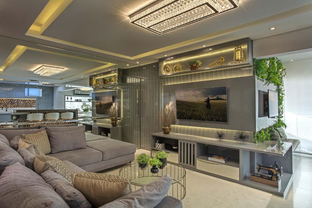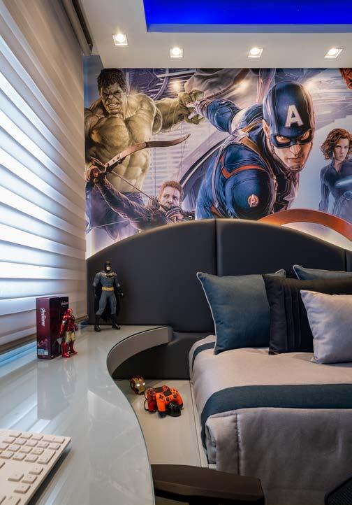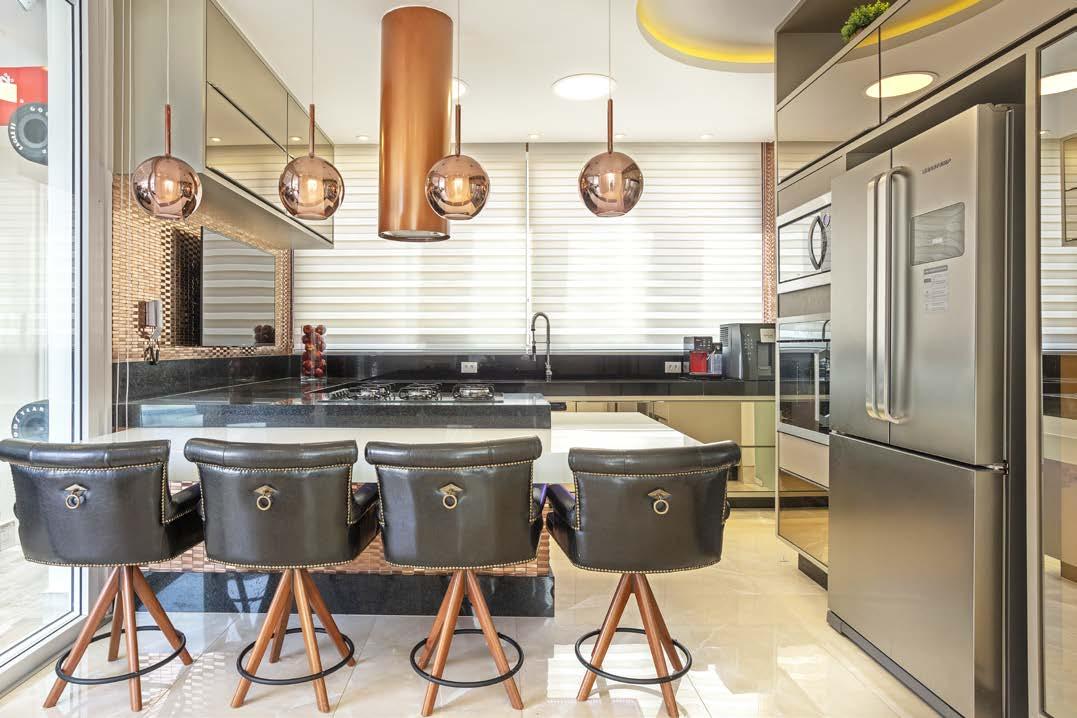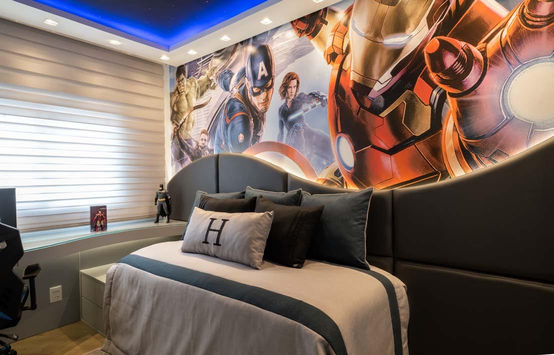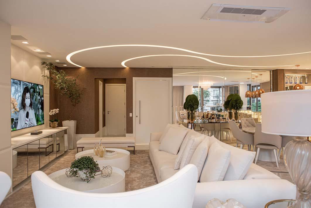 Iara KílarisNa procura por profissionais que projetassem com perfeição e muito conforto um apartamento de 113 m², uma família da Grande São Paulo conheceu pela internet os projetos de interiores assinados pela designer Iara Kílaris. Depois de agendar a primeira visita ao escritório da profissional, o casal passou o final de semana maratonando o Canal Kílaris no Youtube, para conhecer em detalhes o trabalho de Iara. Chegaram para a reunião cheios de ideias e sabendo exatamente o queriam. Assim nasceu o Apartamento Barueri. Por se tratar de um imóvel mais compacto, a varanda gourmet foi integrada à cozinha, recebendo uma única e grande bancada curva com cooktop, usada também para refeições rápidas. De um lado armários, torre para dois fornos e geladeira; de outro churrasqueira e chopeira. A sala de jantar foi ambientada na varanda, deixando assim mais espaço para o living. Na área íntima estão três suítes, máster do casal e dos filhos. No quarto do menino, o tema é super-heróis e decoração com direito a bicama, cadeira gamer, bancada de estudos e teto estrelado com efeito de luz neon. No quarto da filha, todo em branco e rosa, cabeceira almofadada, bancada de estudos, nichos para decoração e um lustre de cristal iluminando todo o ambiente. A suíte máster em tons pastel recebeu uma TV imensa, que ocupa o tamanho da parede em frente a cama. O banheiro é integrado ao quarto com vidro.