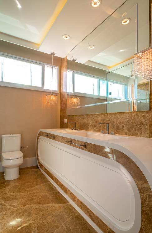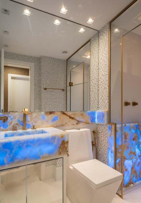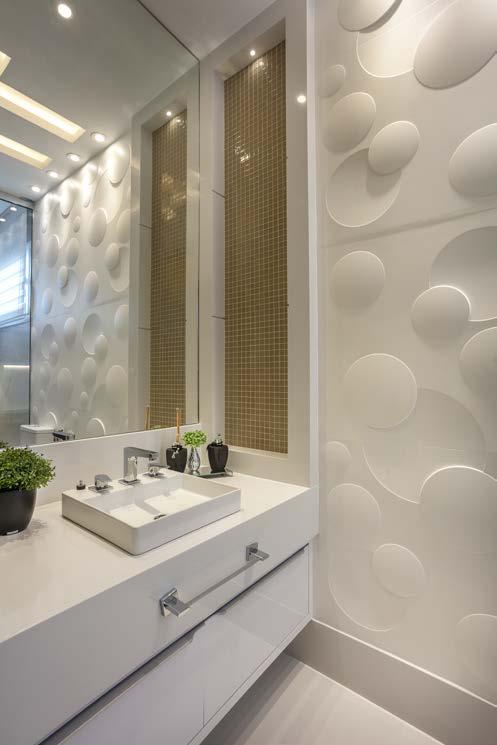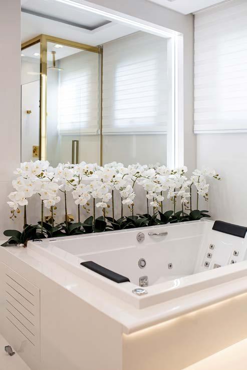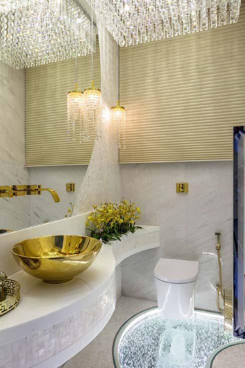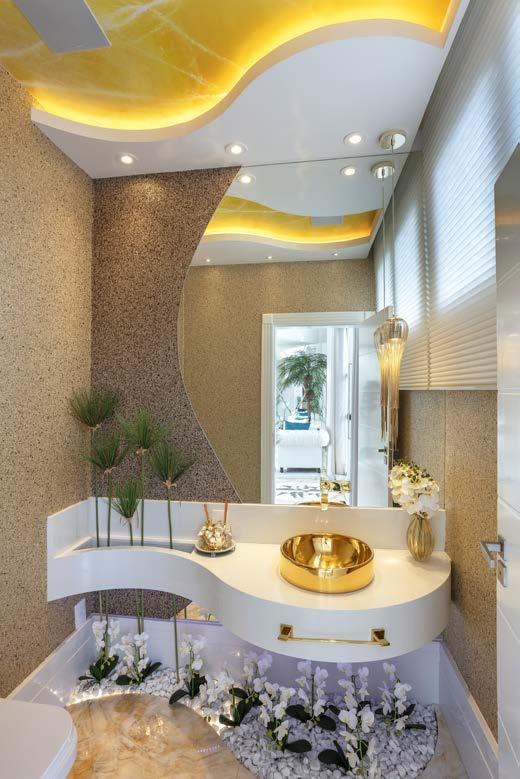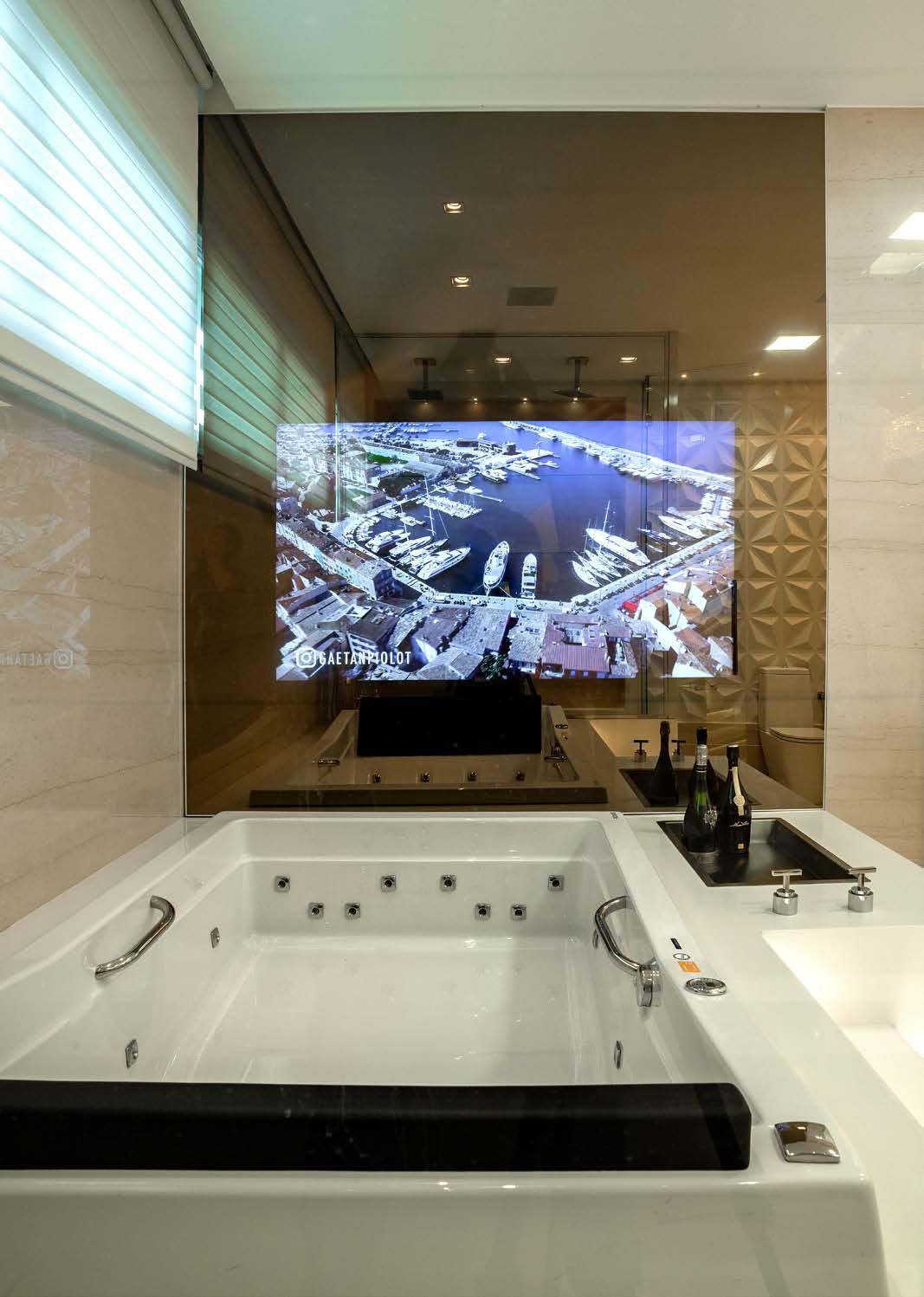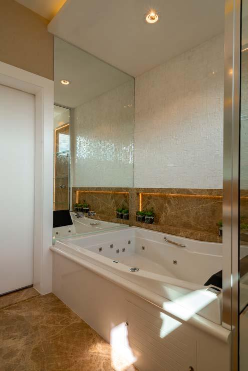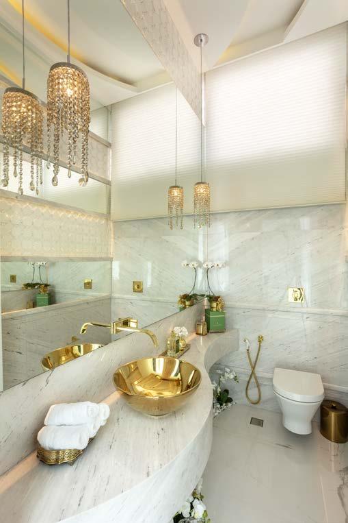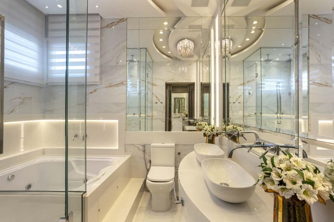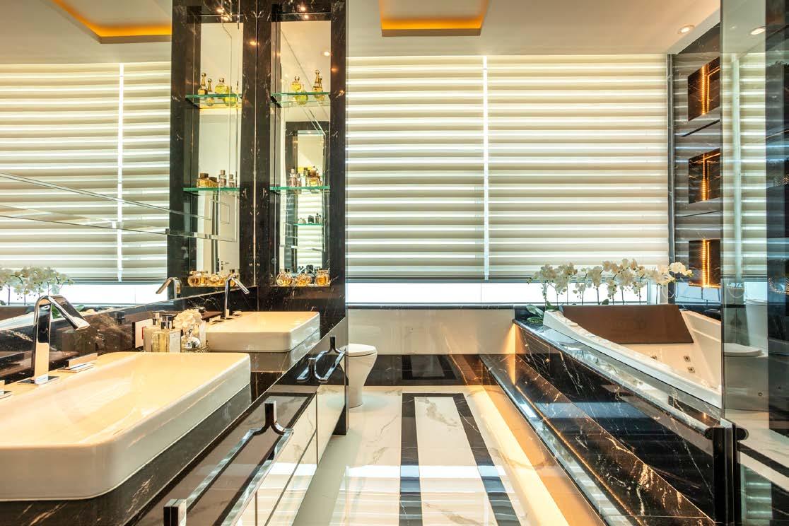 O banho máster em branco e dourado, tem toalheiro aquecido, banheira dupla e bancada com duas cubas, elevando ao máximo o conforto do espaço.