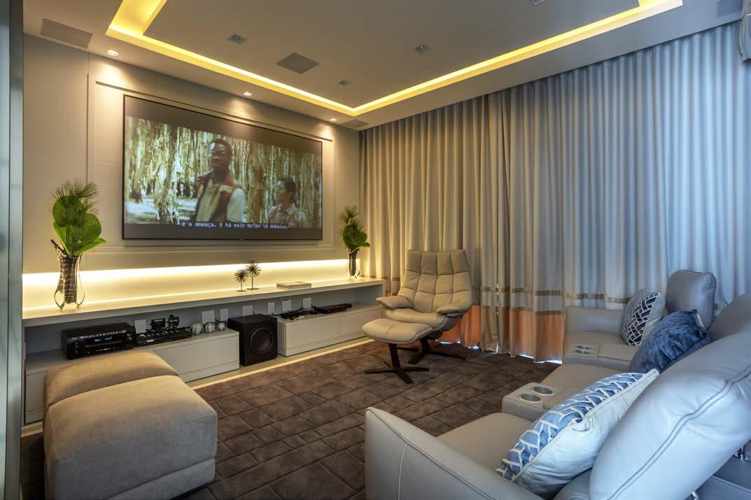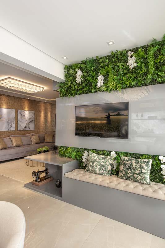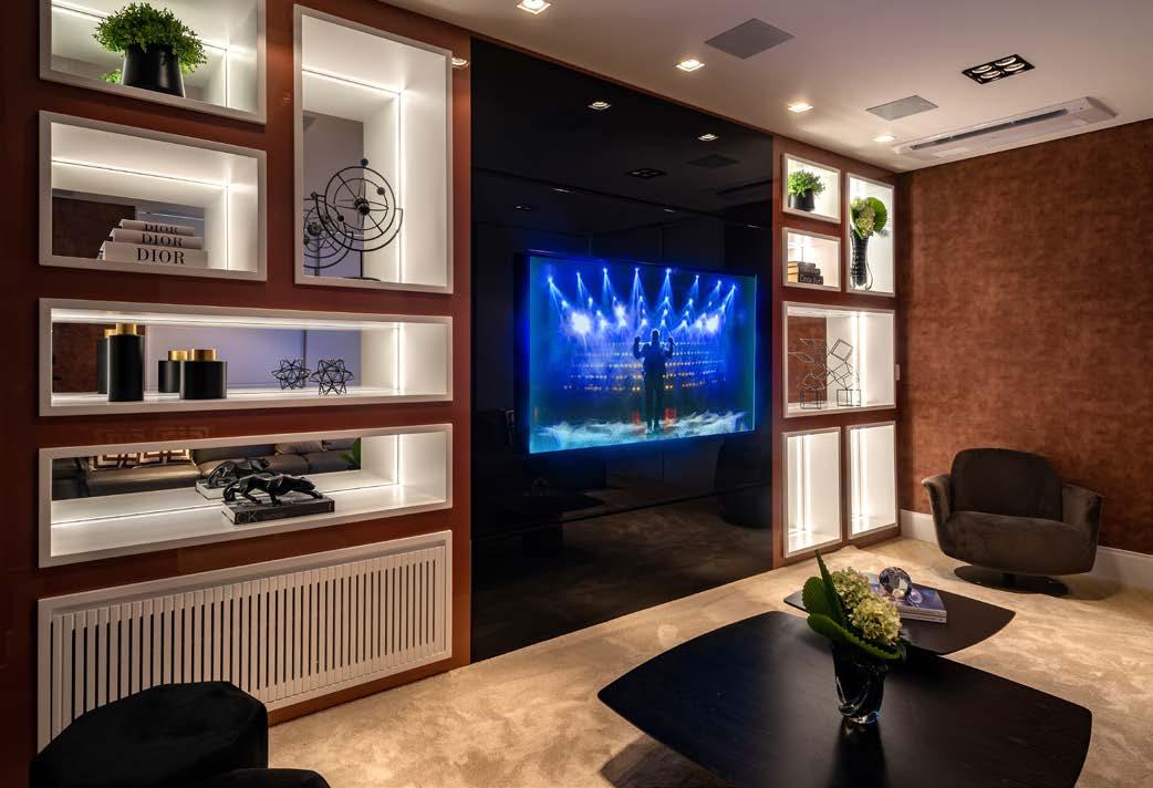 O living, tem a função de home theater e contempla espelhos nas paredes para aumentar a sensação de amplitude. O painel criado para receber a TV possui nichos de decoração e acolheu uma máquina de costura antiga, objeto com memória afetiva da proprietária.