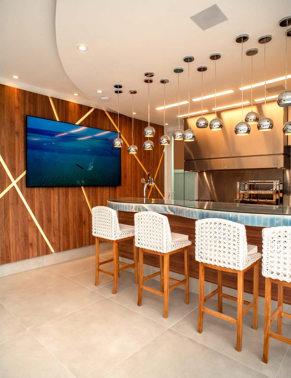 Toda a área social é integrada, living com TV, sala de jantar com uma grande adega, mesa de jogos e balcão bar/gourmet iluminado, com chopeira e churrasqueira. A coifa industrial resolve qualquer problema de cheiro e fumaça.