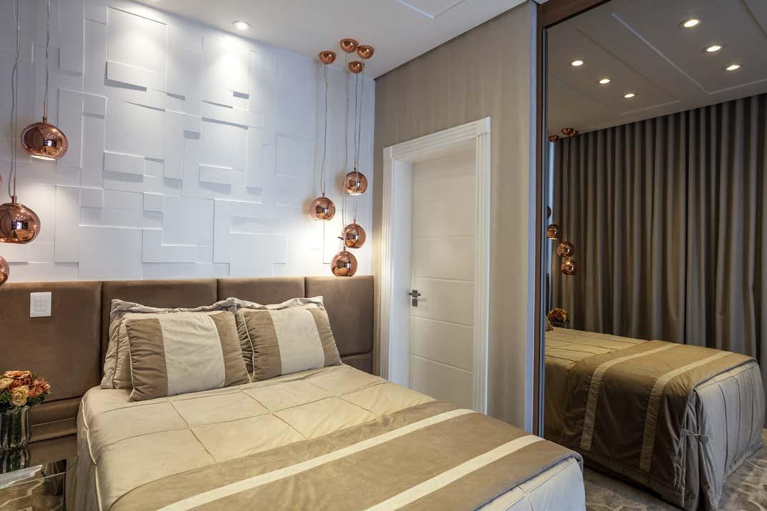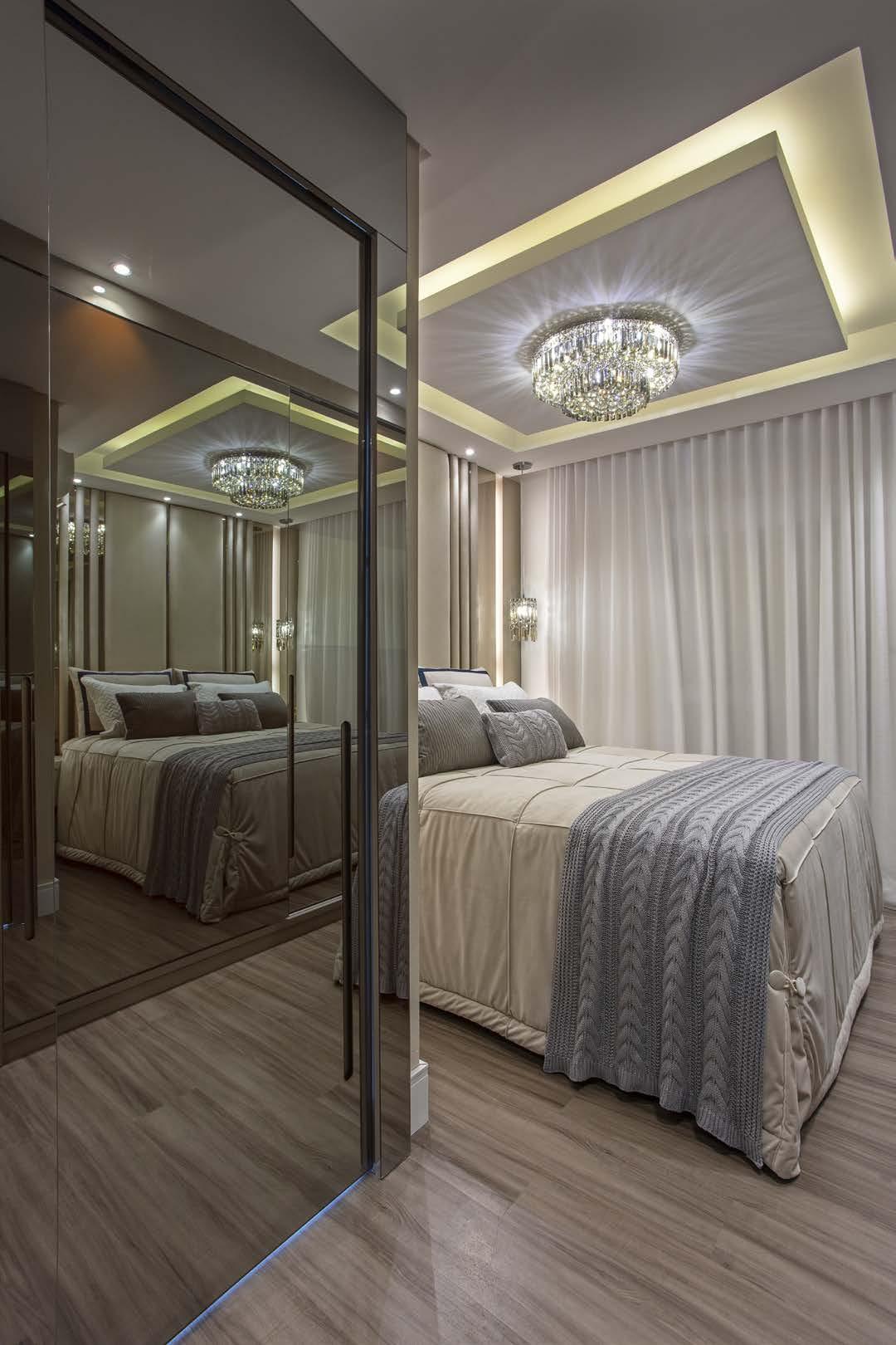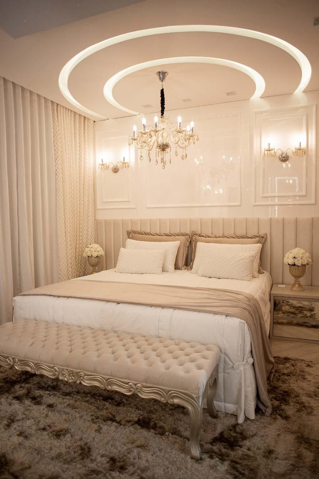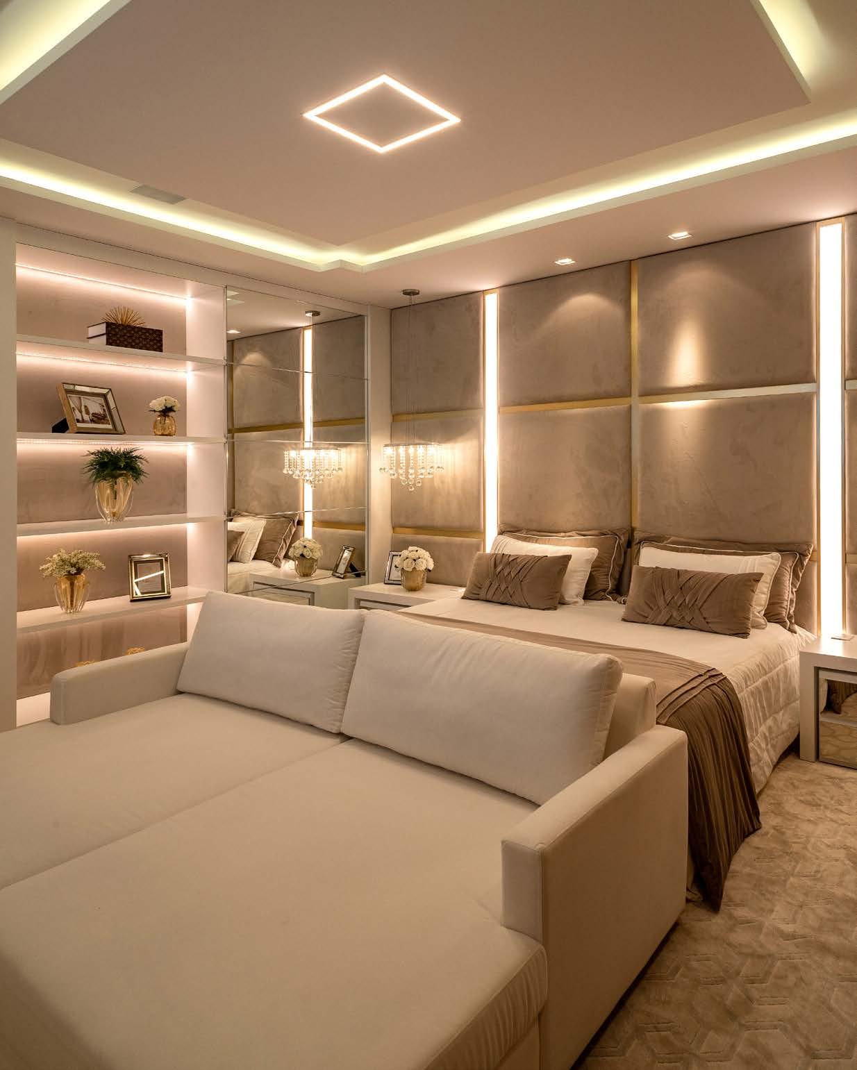 A suíte máster com cores claras, tem ar europeu e um projeto luminotécnico com proposta diferente. Ao invés de pendentes, nas laterais da cama, foram usadas arandelas na parede. O tecido da colcha se repete na cortina e foi instalada uma TV de teto.