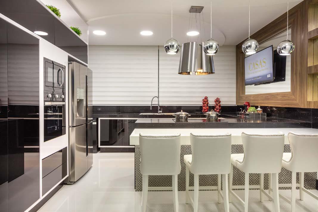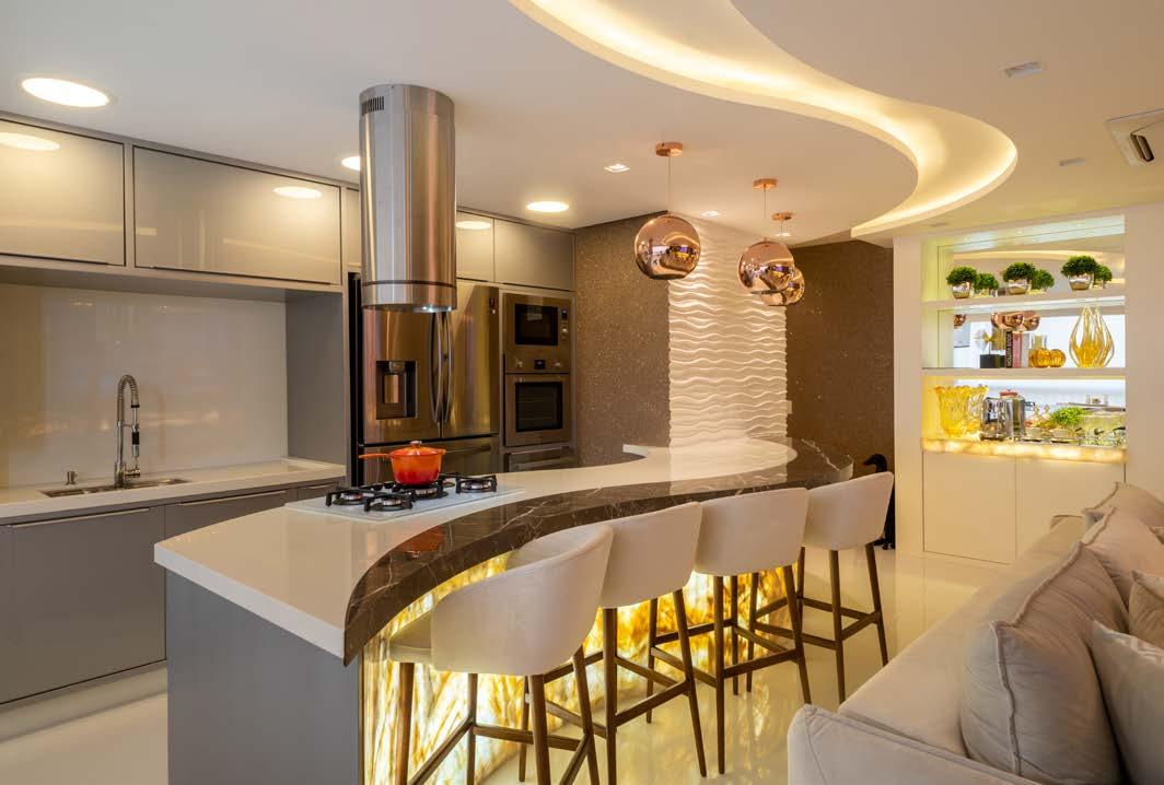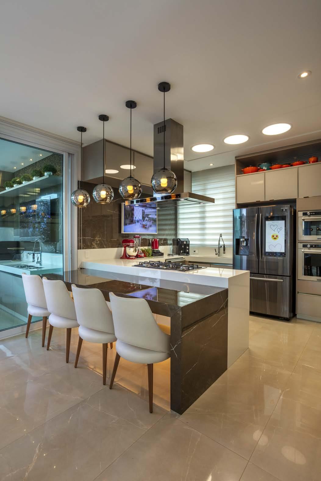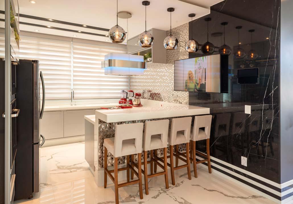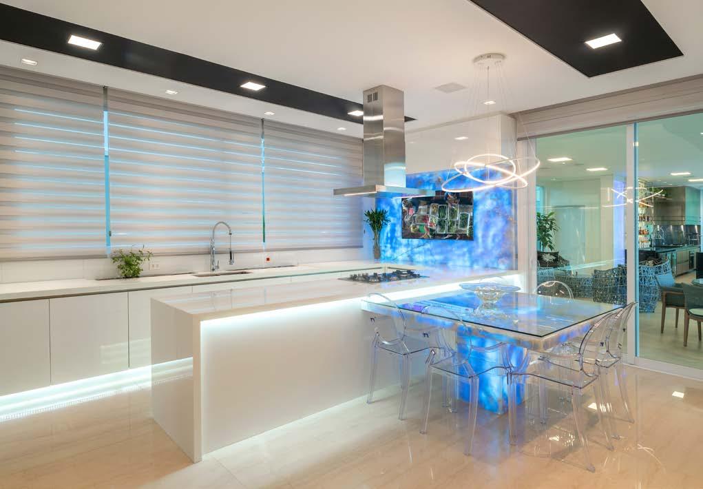 A cozinha é toda branca, composta pela torre quente, cristaleira, bancada de cocção e área molhada. Uma pedra azul iluminada reveste a mesa de refeição e a parede lateral da cozinha, que recebeu uma TV.
