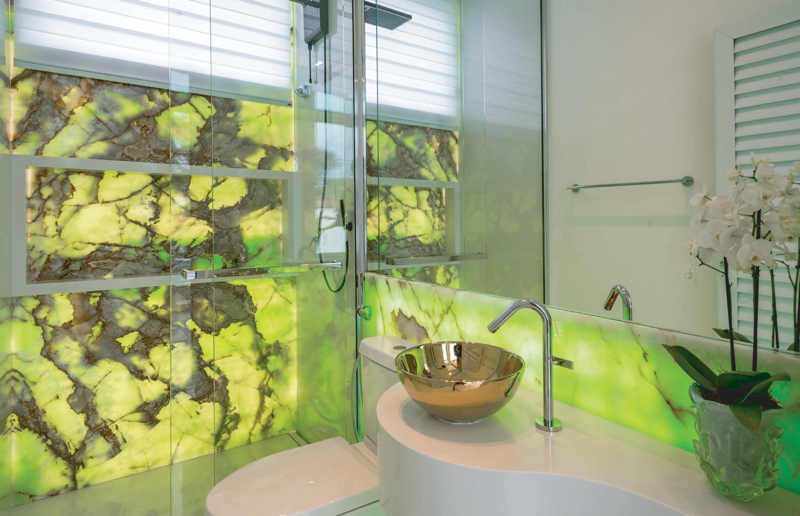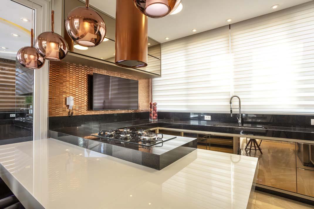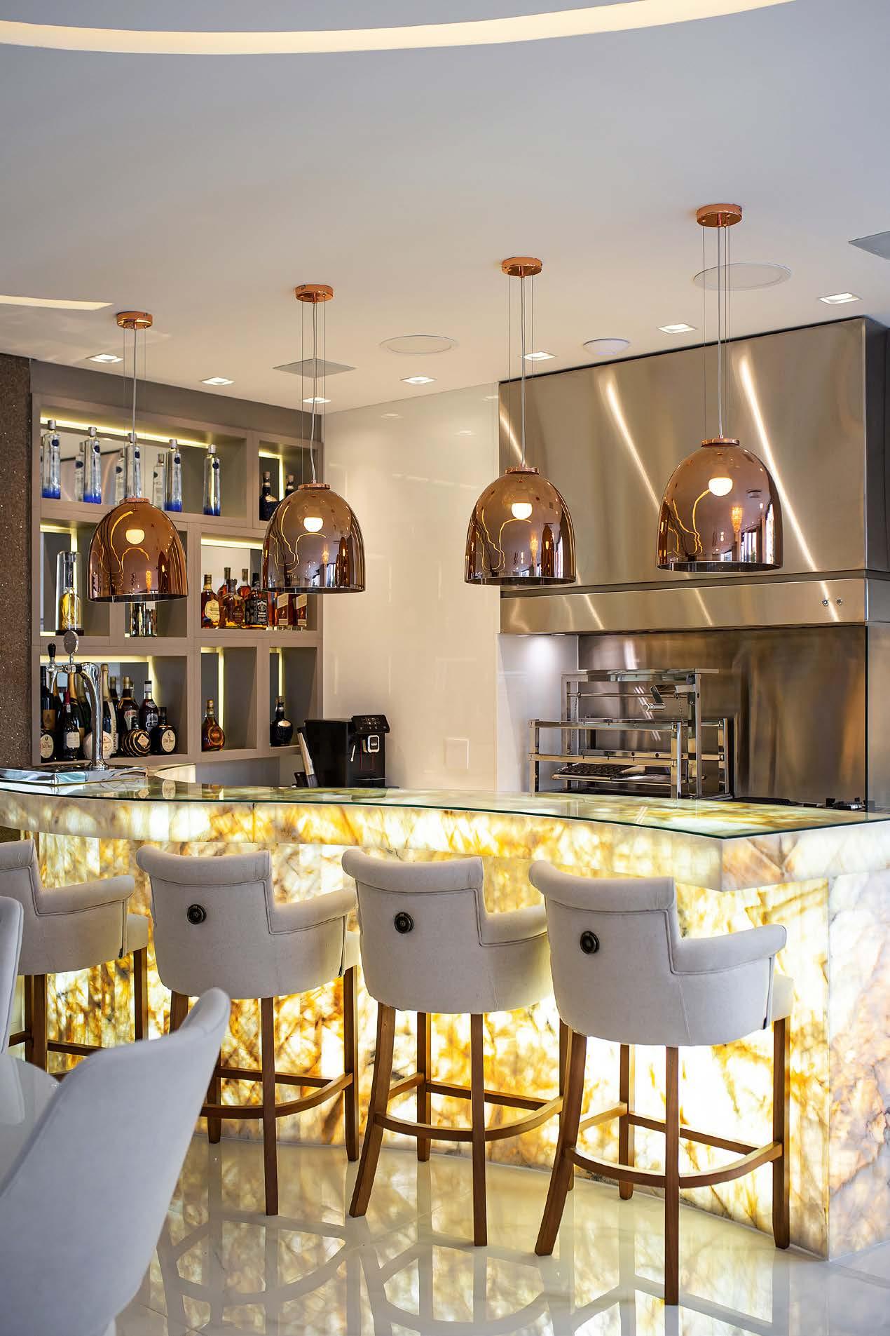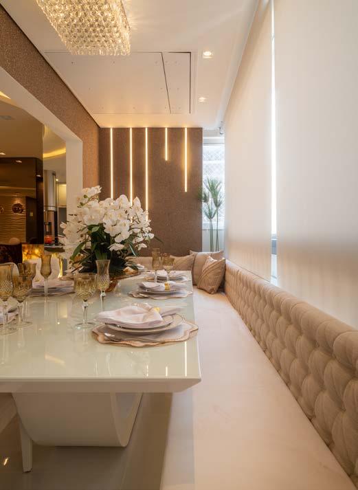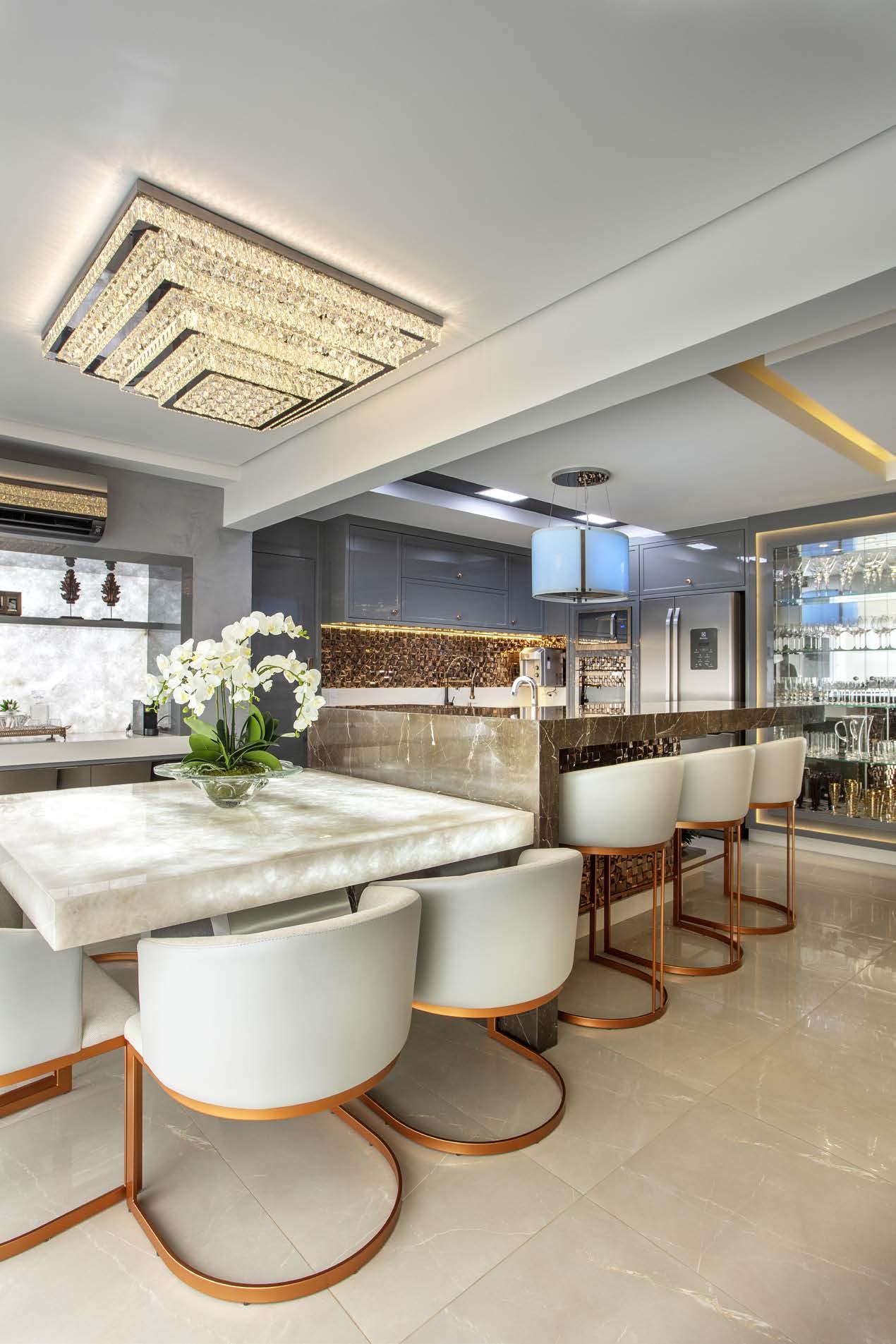 A cozinha é toda branca, composta pela torre quente, cristaleira, bancada de cocção e área molhada. Uma pedra azul iluminada reveste a mesa de refeição e a parede lateral da cozinha, que recebeu uma TV.