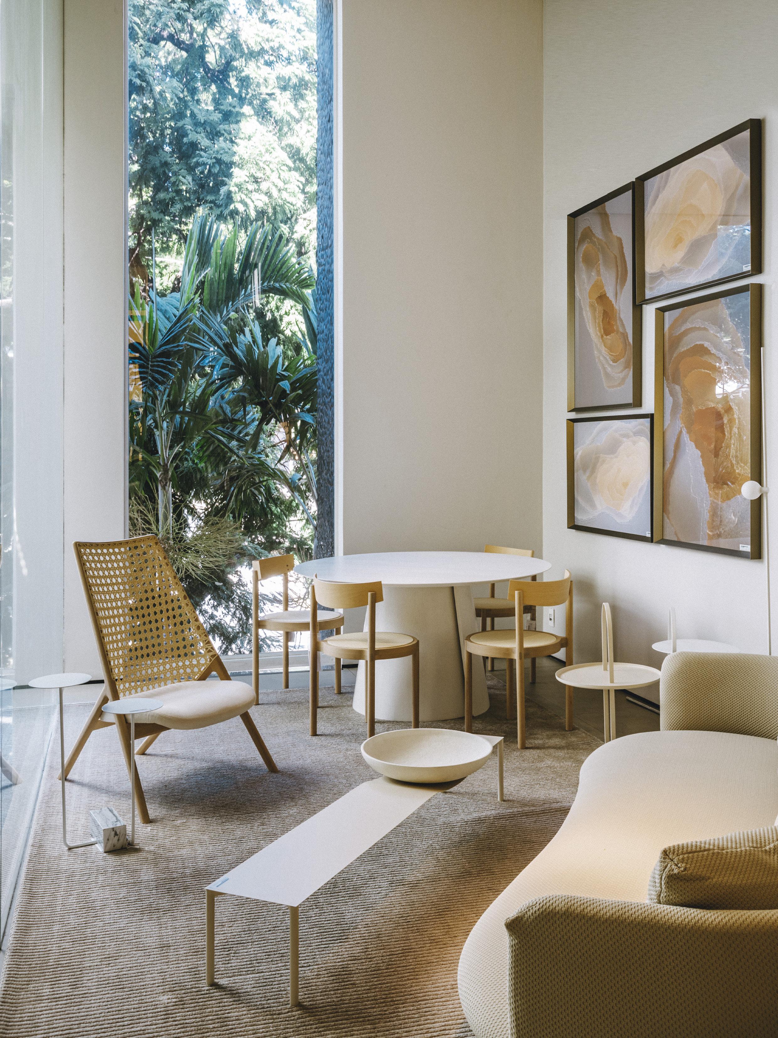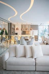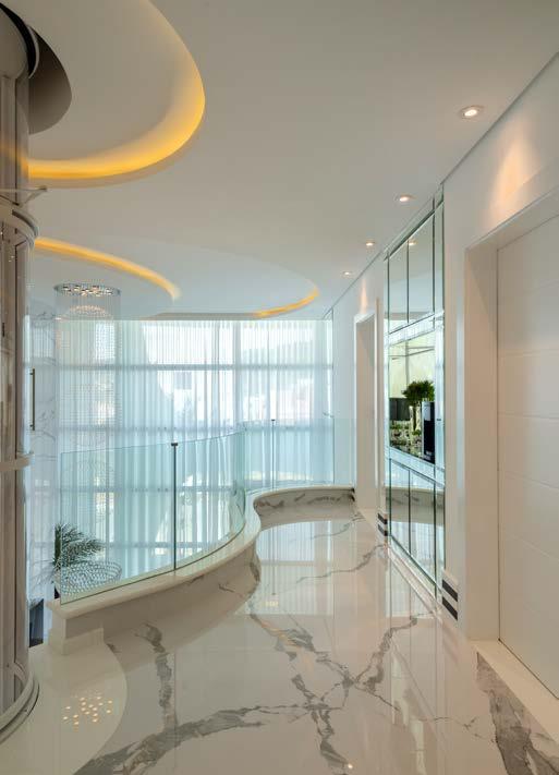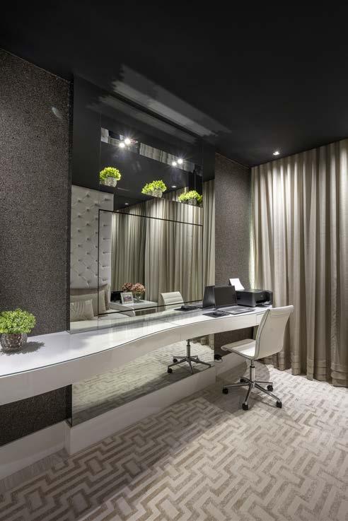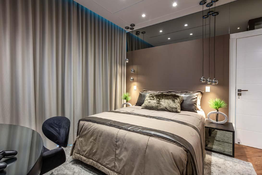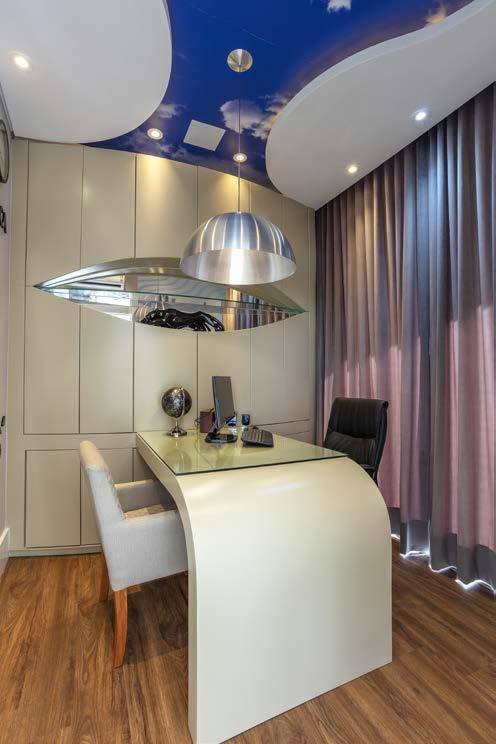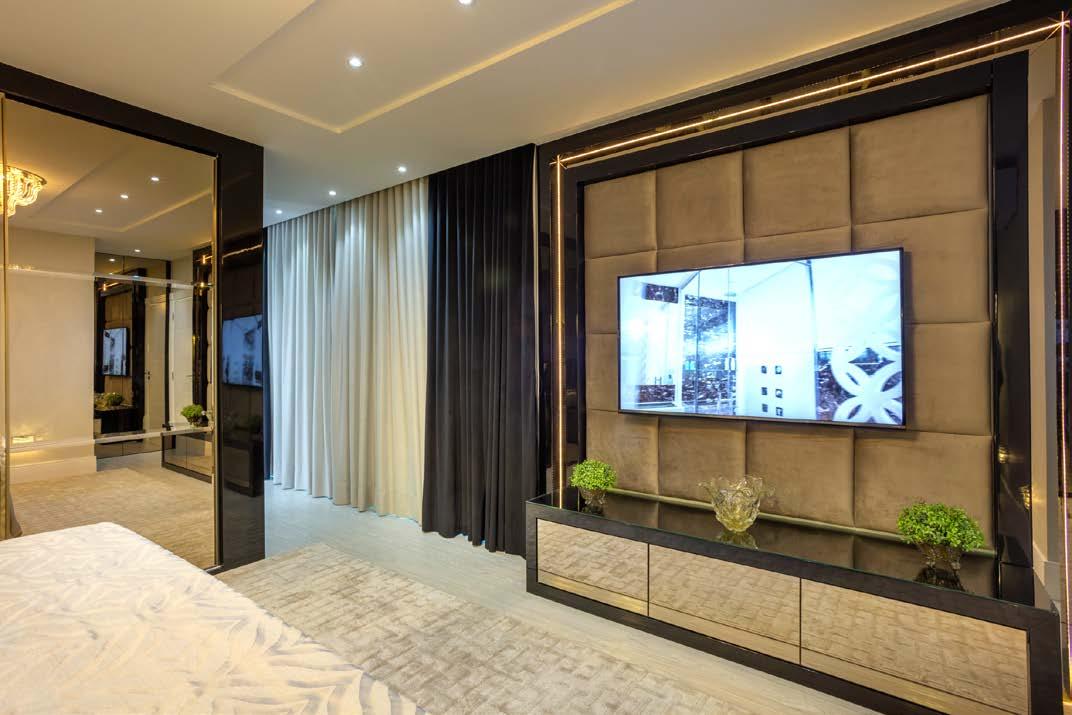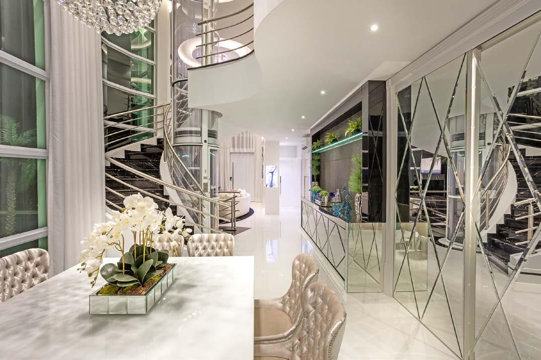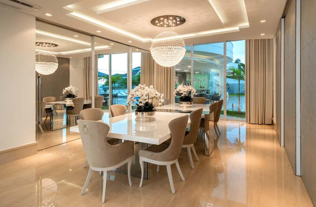 A área social contempla ainda lavabo, sala de cinema e home office. Tudo pode ficar integrado se os grandes painéis de espelho estiverem abertos. A mesma integração acontece na cozinha, onde é possível cozinhar e assistir a um filme. No pavimento superior temos o mezanino com sala íntima e três suítes, sendo a master com uma grande varanda ambientada.
