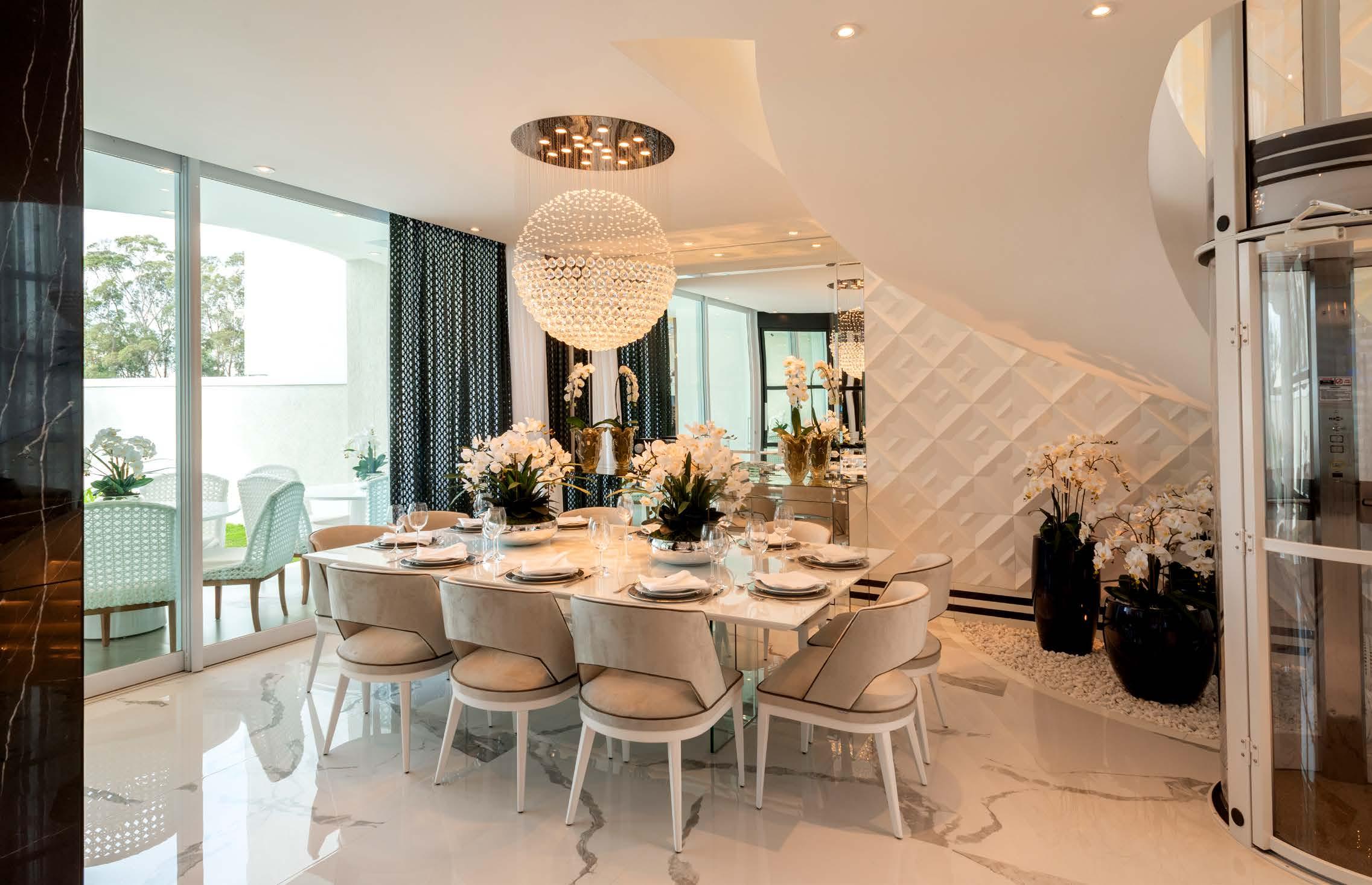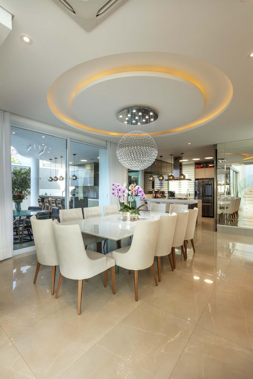 A porta de entrada – deste imóvel localizado em Piracicaba - tem design exclusivo e foi criada por Kílaris. Ao abri-la, nos deparamos com ambientes totalmente integrados e um pé direito duplo que confere elegância e suntuosidade à residência. Living, jantar e cozinha não possuem divisão de paredes e estão voltados para a área de lazer. O home theater, está localizado em um “cubo”, que se fecha com painéis de espelhos. A cozinha - em branco e marrom - é separada do jantar por uma bancada de cocção e banquetas para refeição rápida.