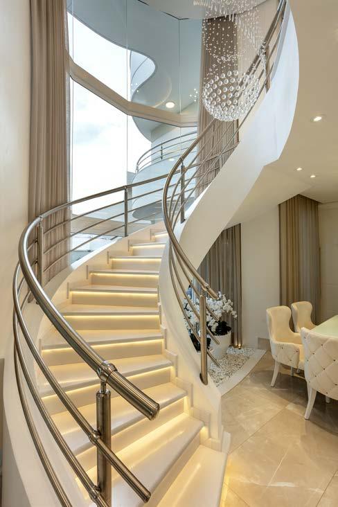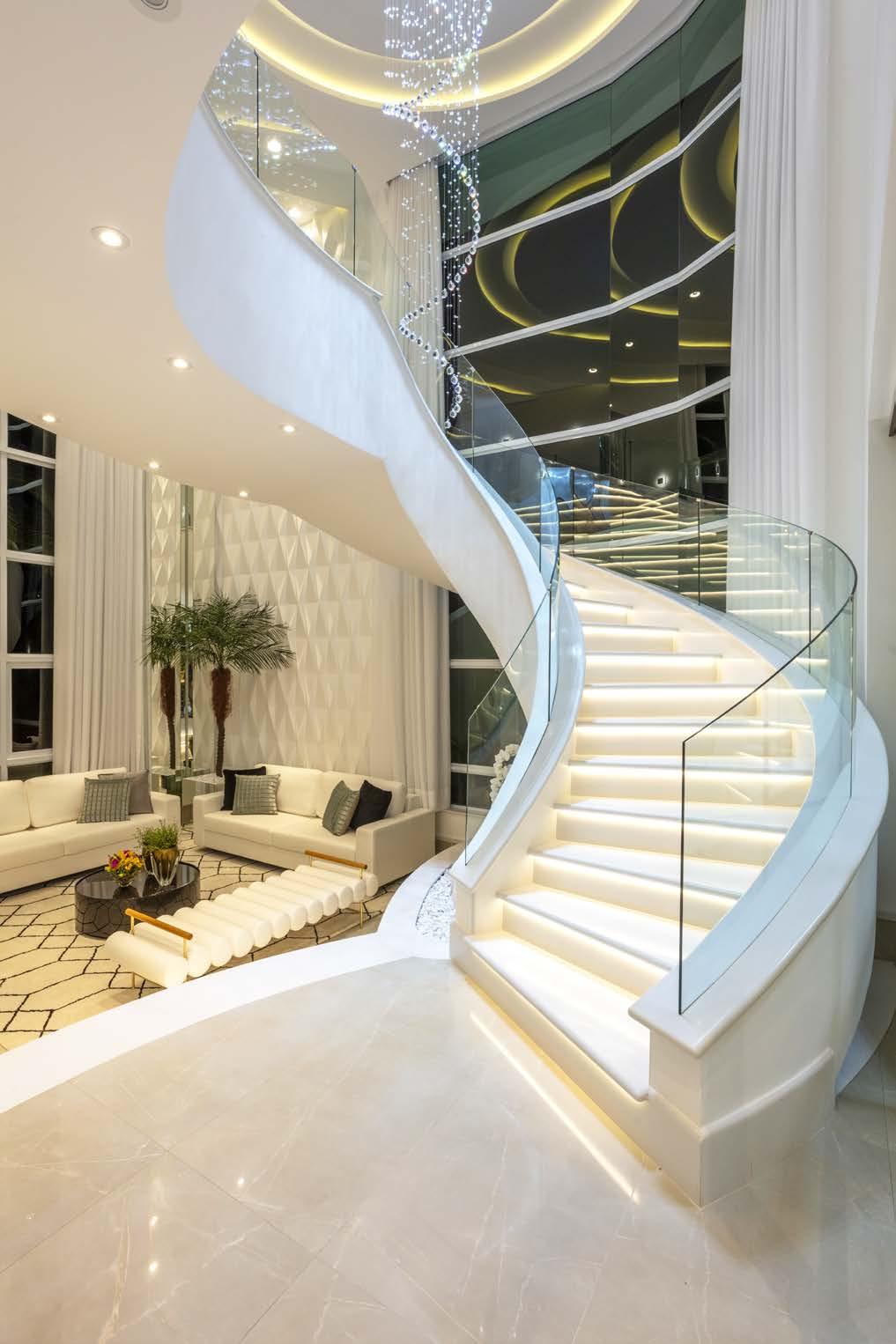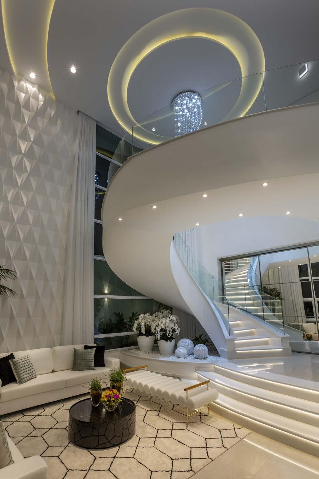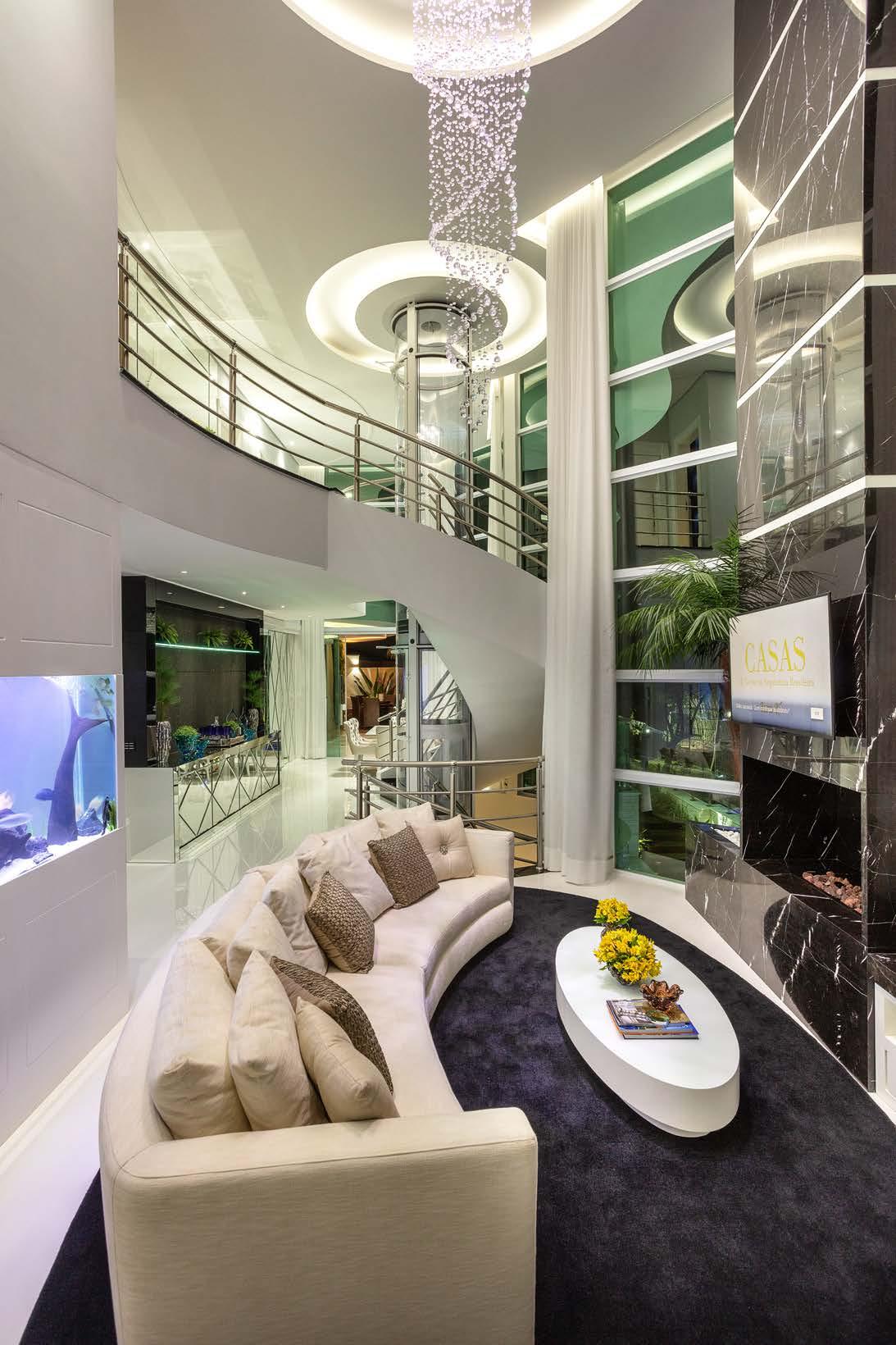 A fachada imponente da Casa Brisas da Mata, que recebeu uma coluna estrutural que personaliza sua entrada, está emoldurada pela marcante paisagem da Serra do Japi, em Jundiai. O verde exuberante também envolve todas as formas arquitetônicas e esculturais, criadas pelo arquiteto Aquiles Nícolas Kílaris para esse imóvel. Outro destaque da fachada é o espelho d´água próximo à porta, para captar boas energias. Ao entrar, somos recebidos por um living suntuoso, decorado em branco e preto, com pitadas de verde escuro no mobiliário. Um grande painel em mármore acomoda TV e lareira, sendo o grande destaque do ambiente. Junto a ele temos a sala de jantar, também decorada em cores neutras. Na transição entre os ambientes, um bar projetado em mármore acomoda taças e bebidas. A cozinha é totalmente integrada ao jantar e a área social possui um lavabo e home theater, com uma grande tela de cinema instalada em um painel com efeitos luminotécnicos. A escada no centro da casa tem ao seu lado um elevador panorâmico. No segundo piso estão localizados o escritório, duas suítes para hóspedes e a suíte master, composta por closet e sala de banho. A área de lazer foi invadida pela atmosfera de praia graças à pedra azul iluminada na bancada de refeições, na parede do gourmet e ao mobiliário todo branco. O lazer conta ainda com piscina, spa aquecido, cascata e recantos de contemplação.
