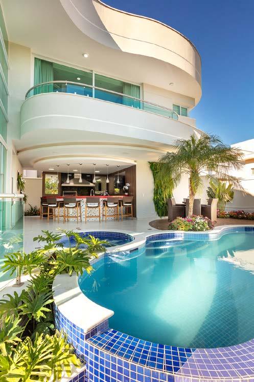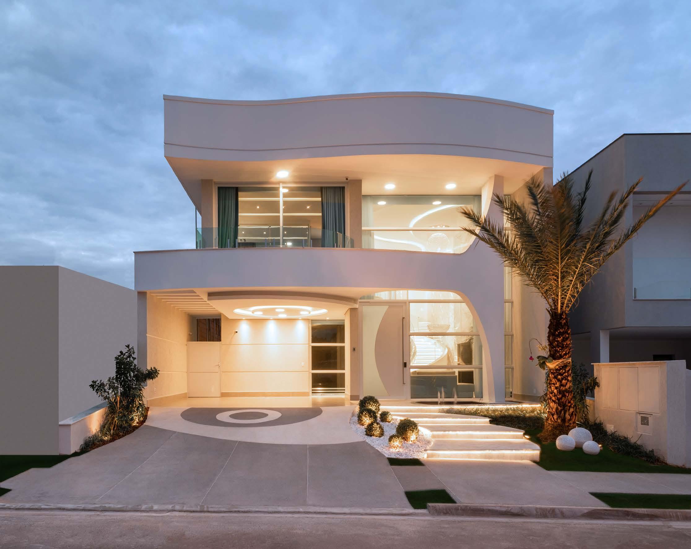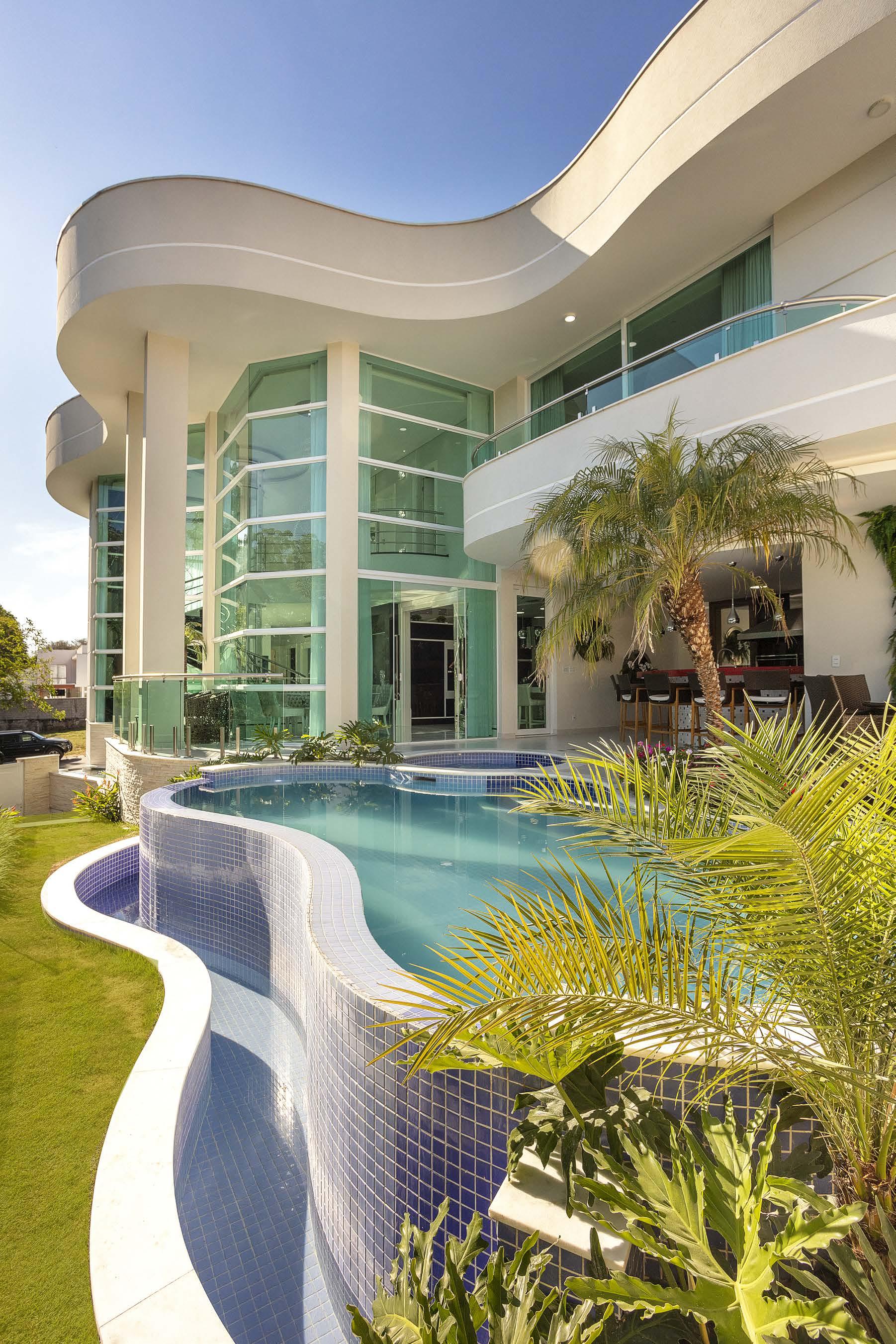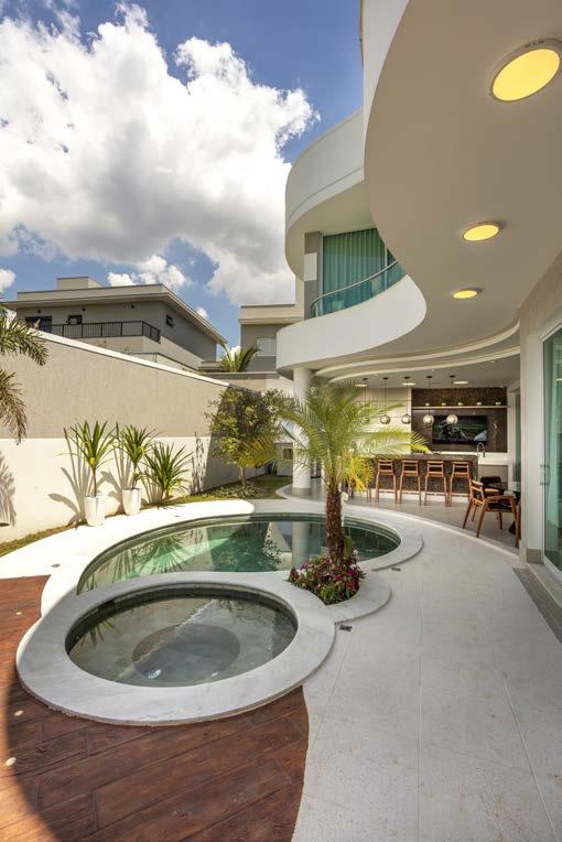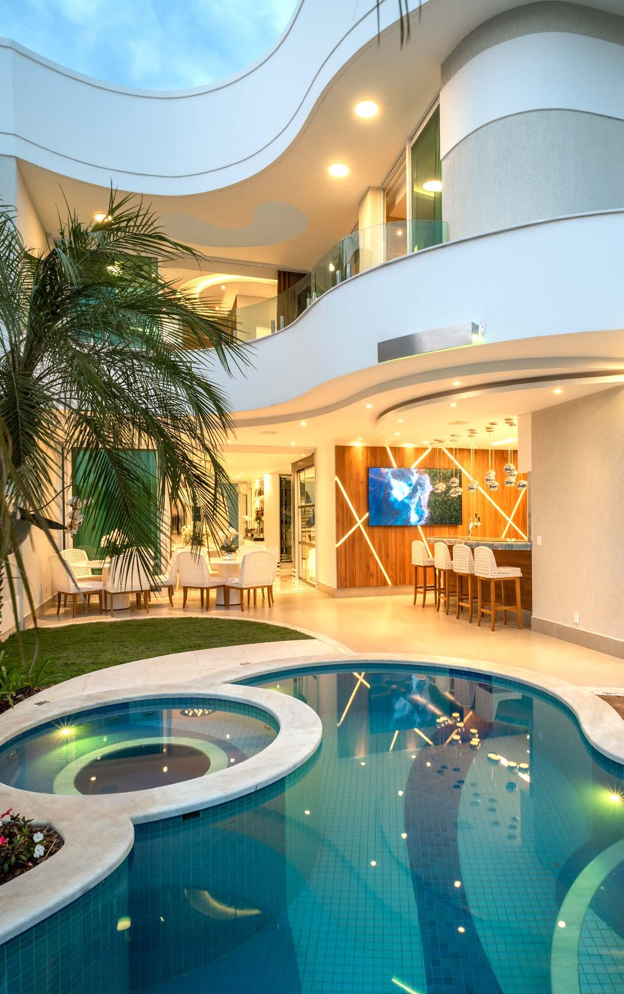 A fachada escultural possui colunas exclusivas que conferem “movimento” à construção e um espelho d’água na entrada da casa. Por se tratar de um terreno largo na frente e reduzido nos fundos, o projeto promoveu a integração dos ambientes voltados para a piscina, aumentando a sensação de alongamento da área.