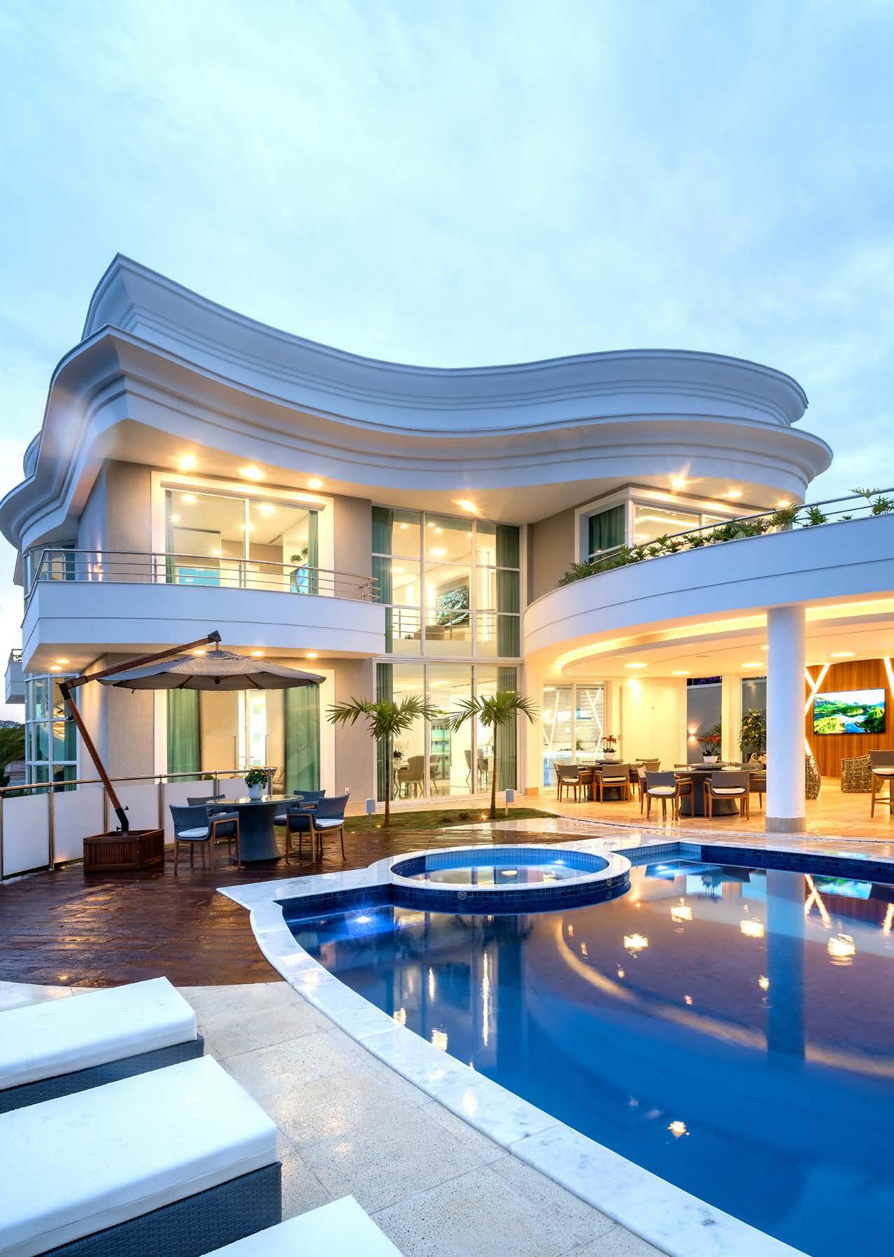 A casa foi projetada com dois pavimentos. No piso térreo está toda a área social. Living, jantar, home theater, cozinha e área de lazer completa. No pavimento superior destaque para a área íntima do imóvel, com três suítes e o escritório.