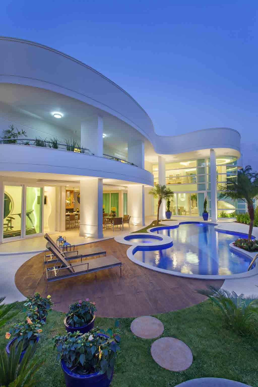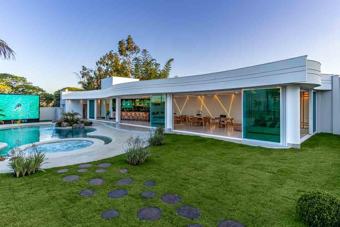 Nícolas Kílaris complementou a casa principal com as curvas e linhas sinuosas características de seu estilo, integrou os ambientes e projetou toda a área de lazer.