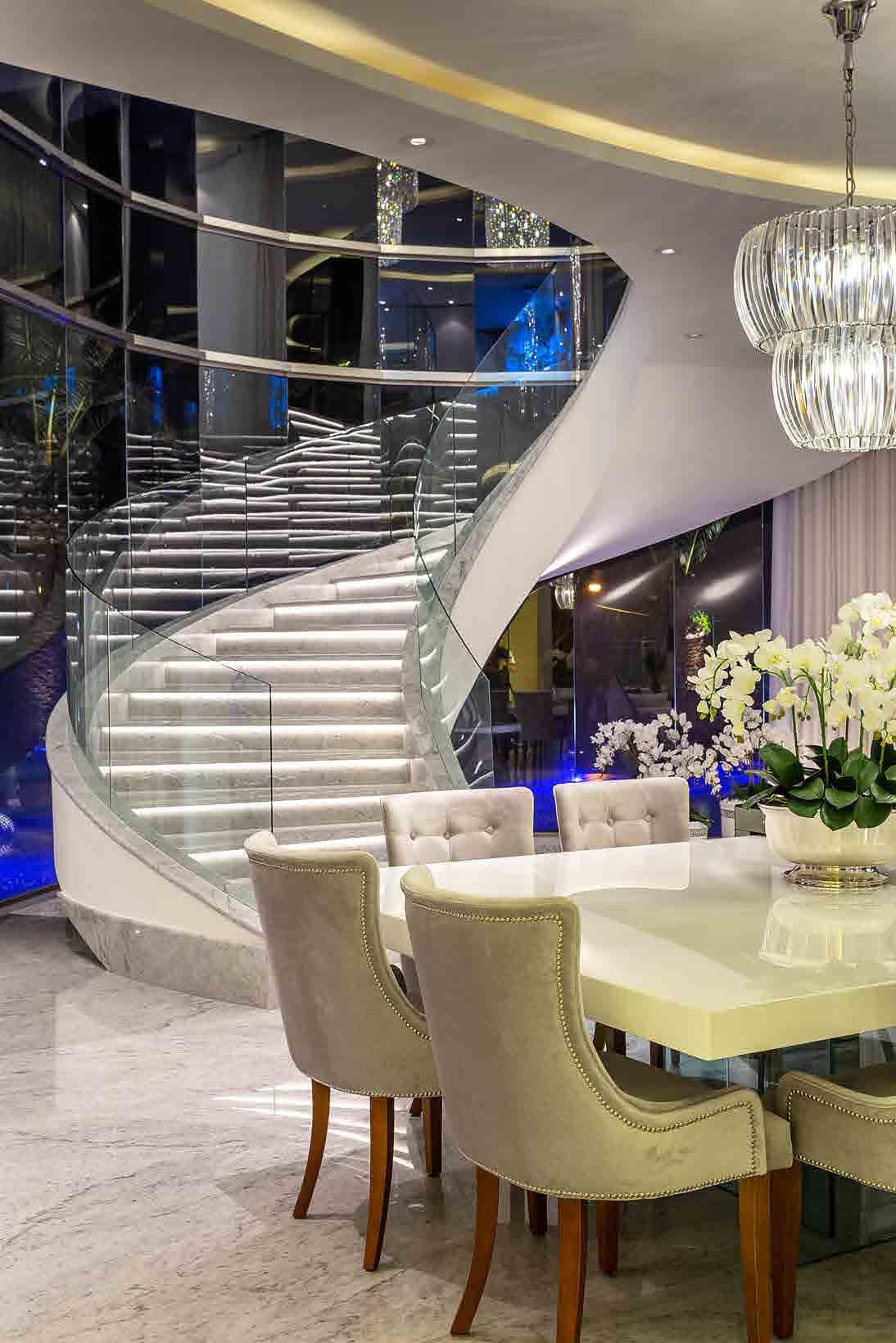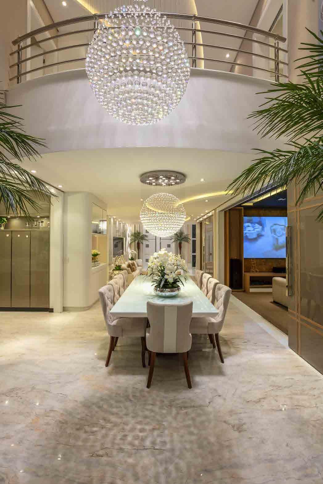 A sofisticação também se reflete nos materiais utilizados, como mármores, pedras iluminadas e muitos cristais. Na área íntima, há três suítes completas que proporcionam todo o conforto aos proprietários.