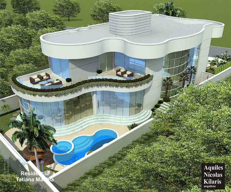 A casa, também é cercada por espelho d´água que percorre seu entorno pelo jardim, até chegar aos dois quartos de hóspedes em formato redondo. A metragem total do terreno é de 1000 m² e o projeto tem 913 m². O projeto segue o estilo característico do arquiteto Aquiles Nícolas Kílaris, que valoriza a arquitetura das curvas.