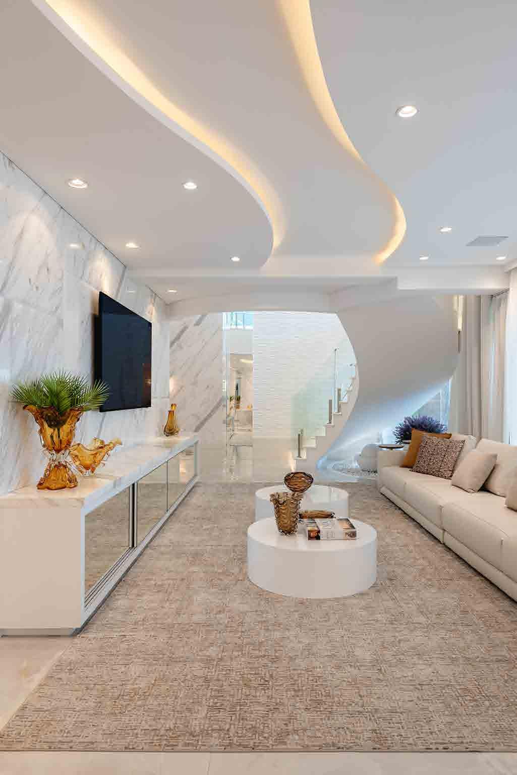 O living suntuoso é integrado com a sala de jantar. Nas suas laterais estão a cozinha de um lado e a sala de cinema do outro, ambas isolados com os painéis, que podem ser abertos para promover mais integração. No piso superior, está a área íntima da casa.
