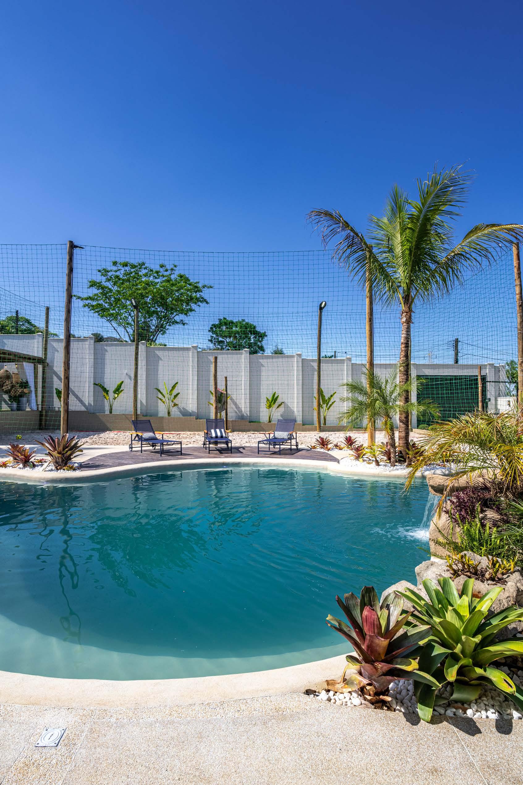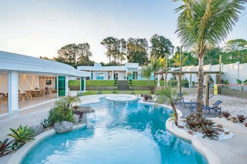 Na casa, living, cozinha e bar dividem o mesmo espaço e são voltados para o lazer. A área íntima conta com três quartos. A área de lazer começa com um grande pergolado de convivência e descanso. A estrela do lazer é a piscina com efeito de areia em formato orgânico que remete a praia e sua bela cascata de pedras com plantas naturais que aumentam a sensação de bem-estar.