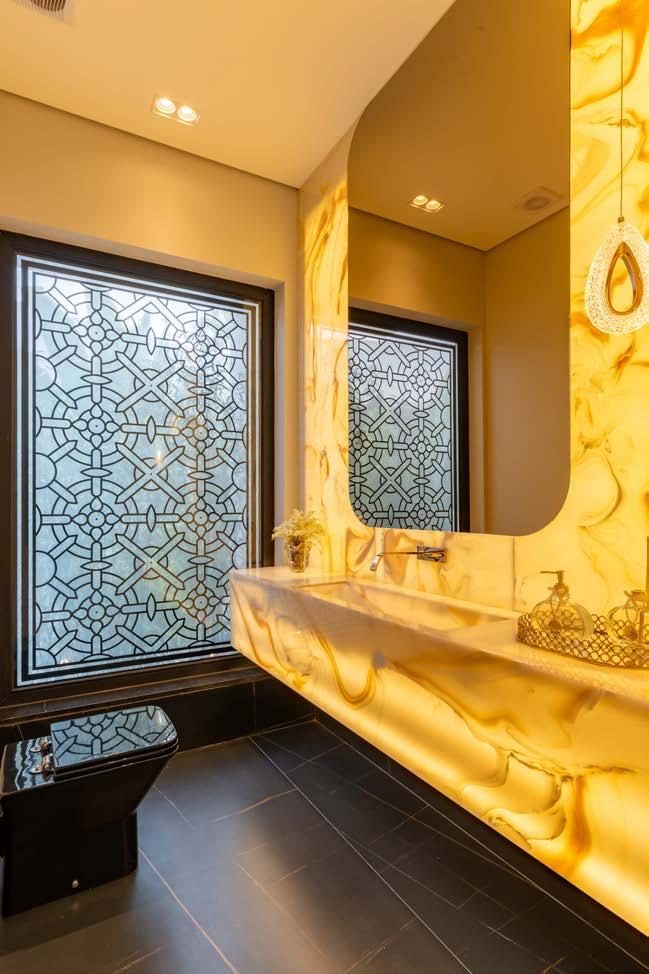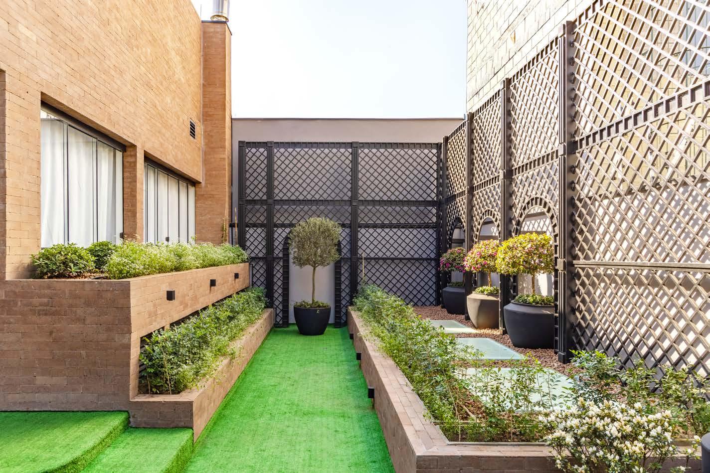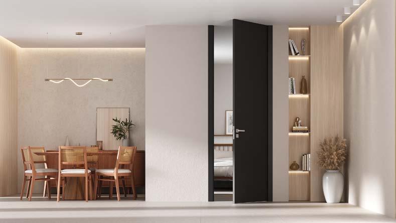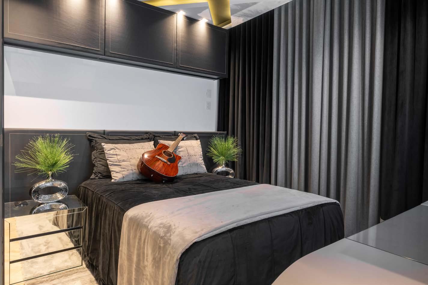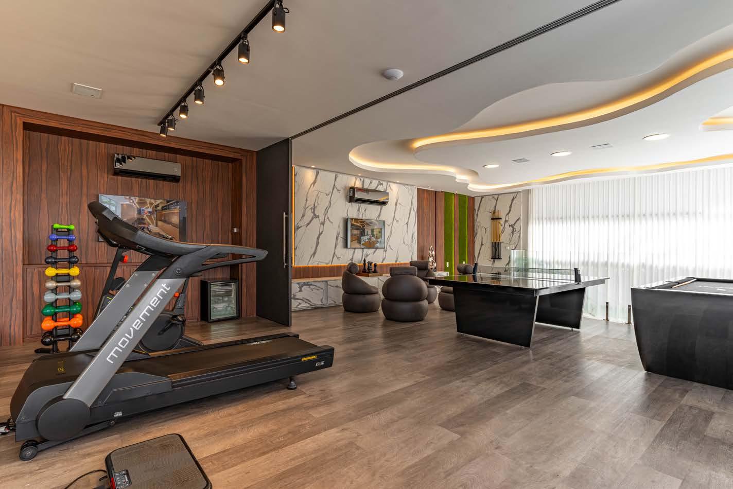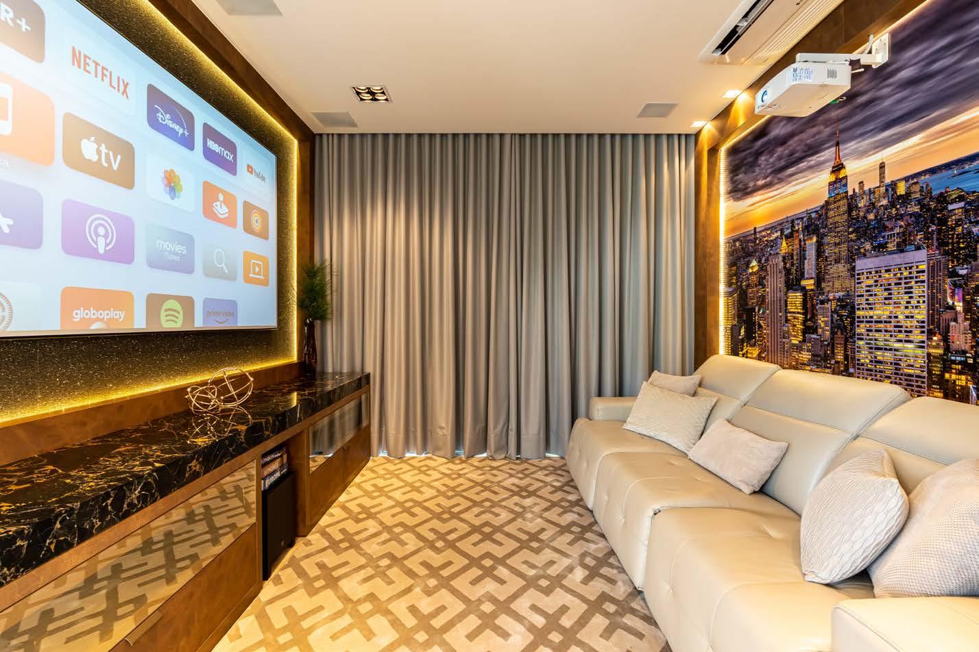 A integração de ambientes é outra forte característica, unindo living, sala de jantar e bar. Um grande painel de espelho, quando aberto, proporciona a integração destes espaços com a sala de cinema e o home office, ambientado no universo do futebol.
