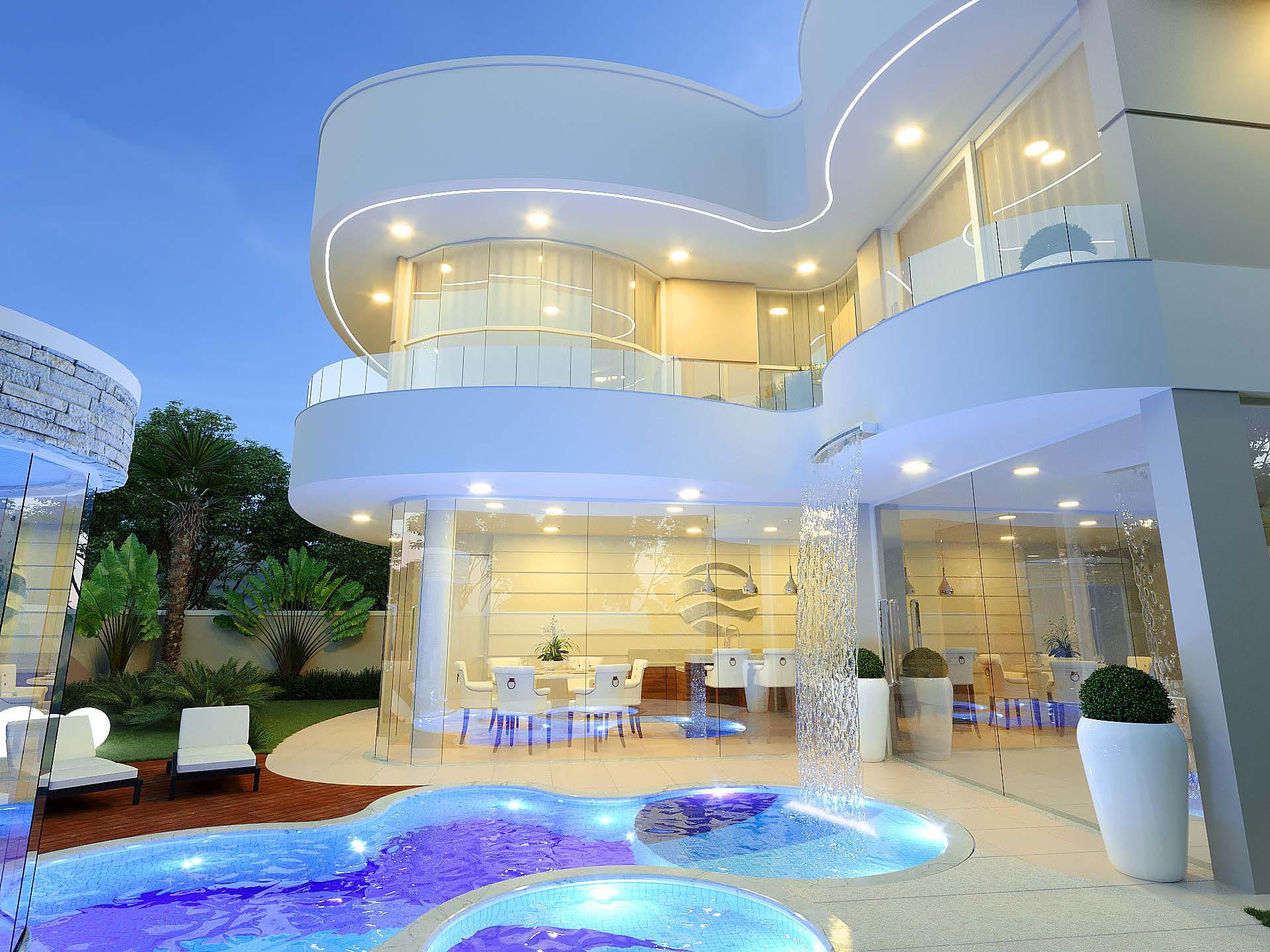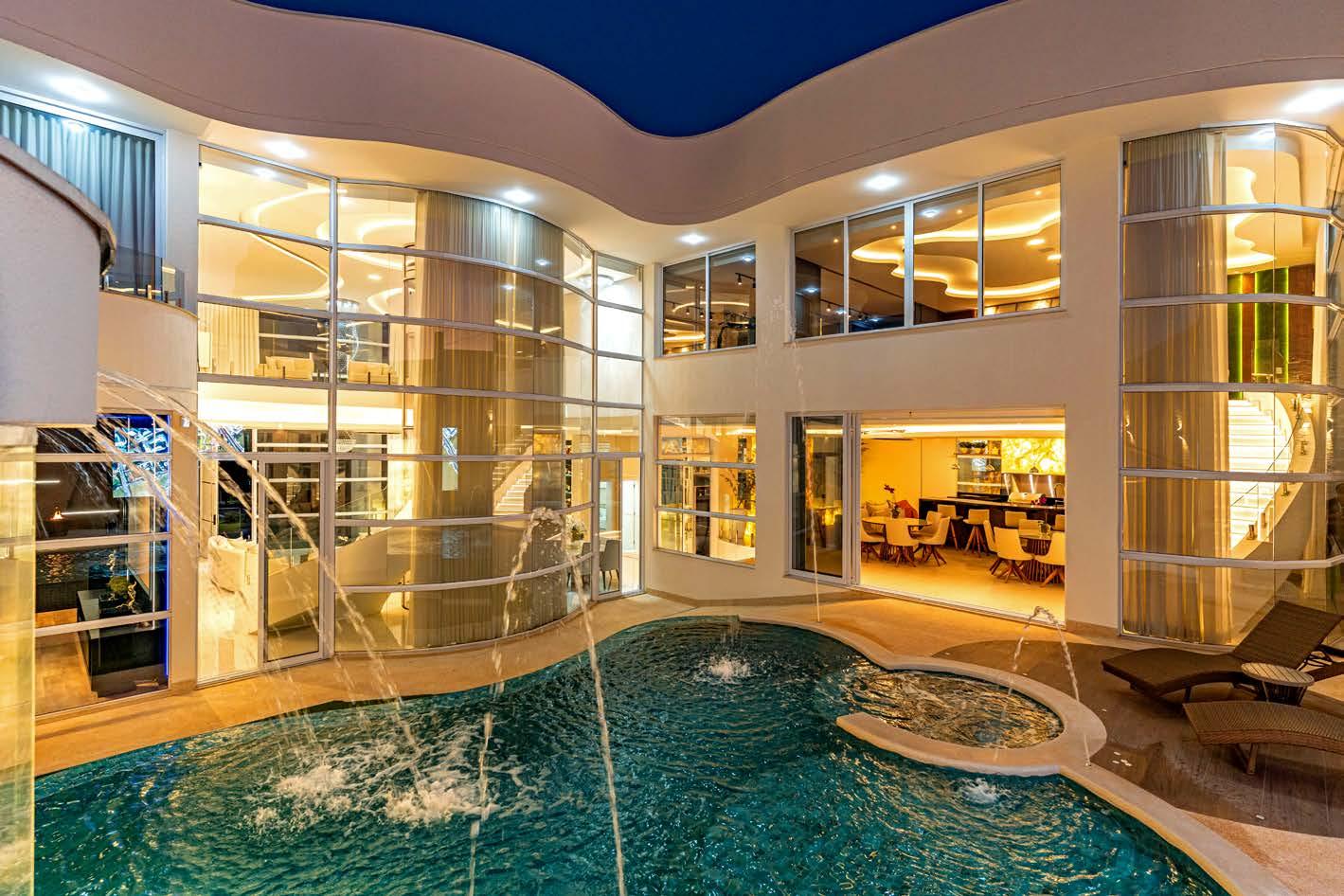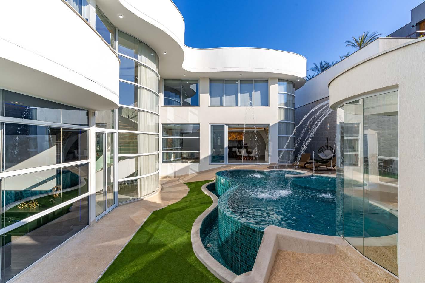 A arquitetura das curvas é a inspiração de todo o imóvel e está presente também na fachada interna, concebendo movimento que abraça o jardim, a piscina em formato orgânico, o deck e a sauna à beira da piscina.